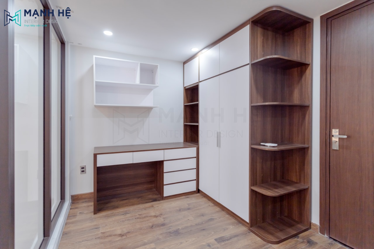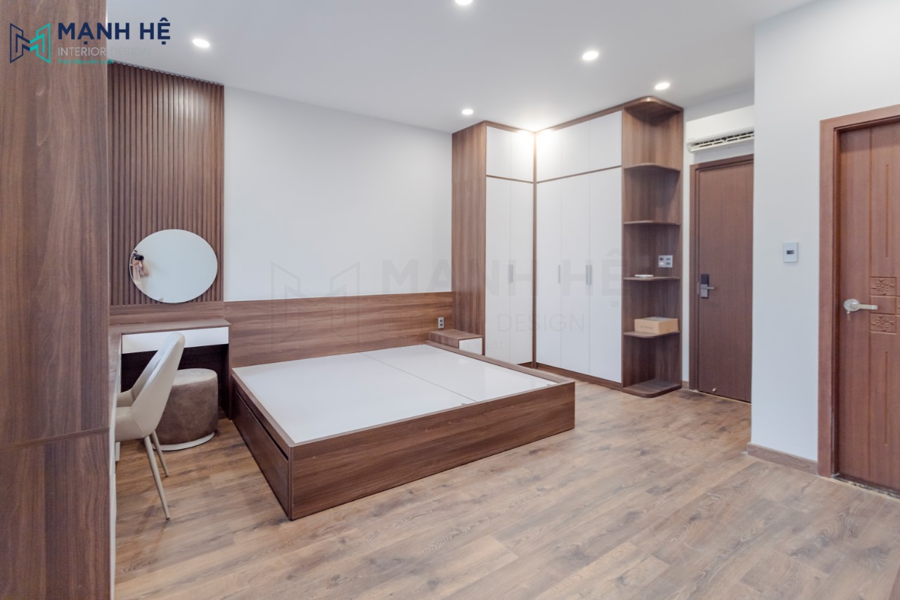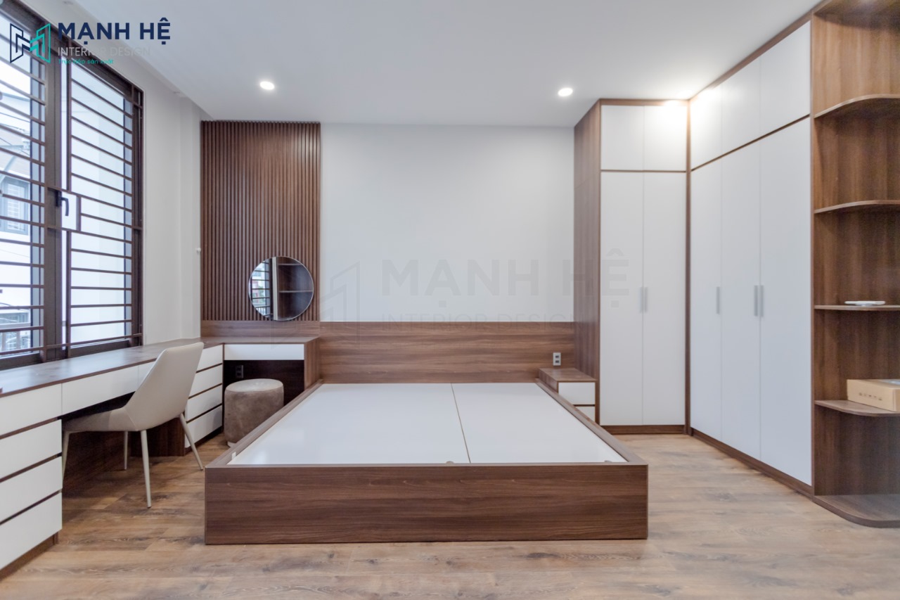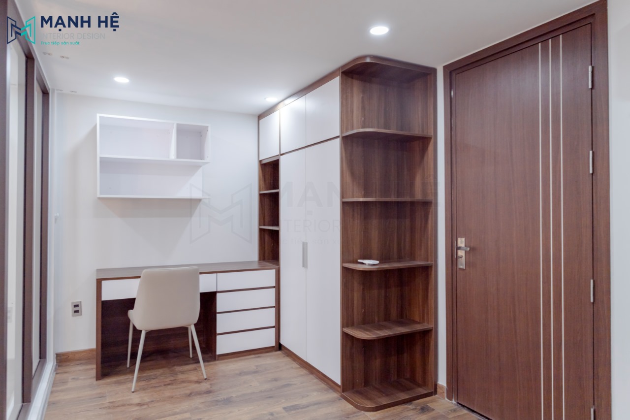 Phòng ngủ chọn gam màu nâu làm gam màu chủ đạo với nội thất gỗ công nghiệp đồng bộ màu. Thiết kế tủ quần áo cao đụng trần cánh mở tích hợp thêm các kệ trang trí, bàn làm việc kết hợp kệ sách treo tường màu trắng.
