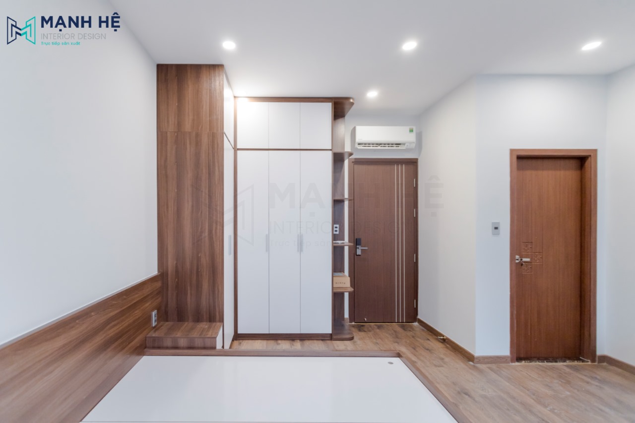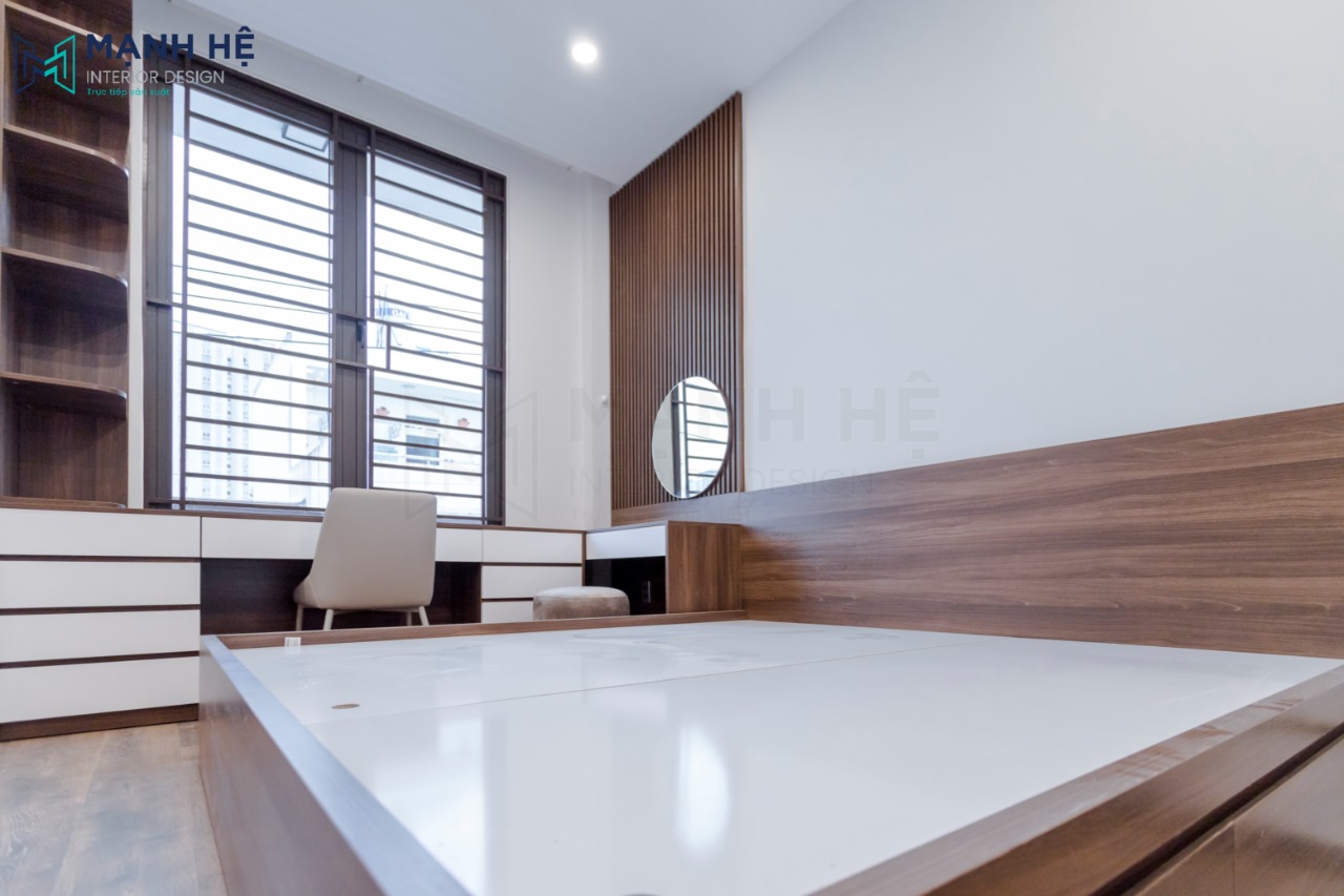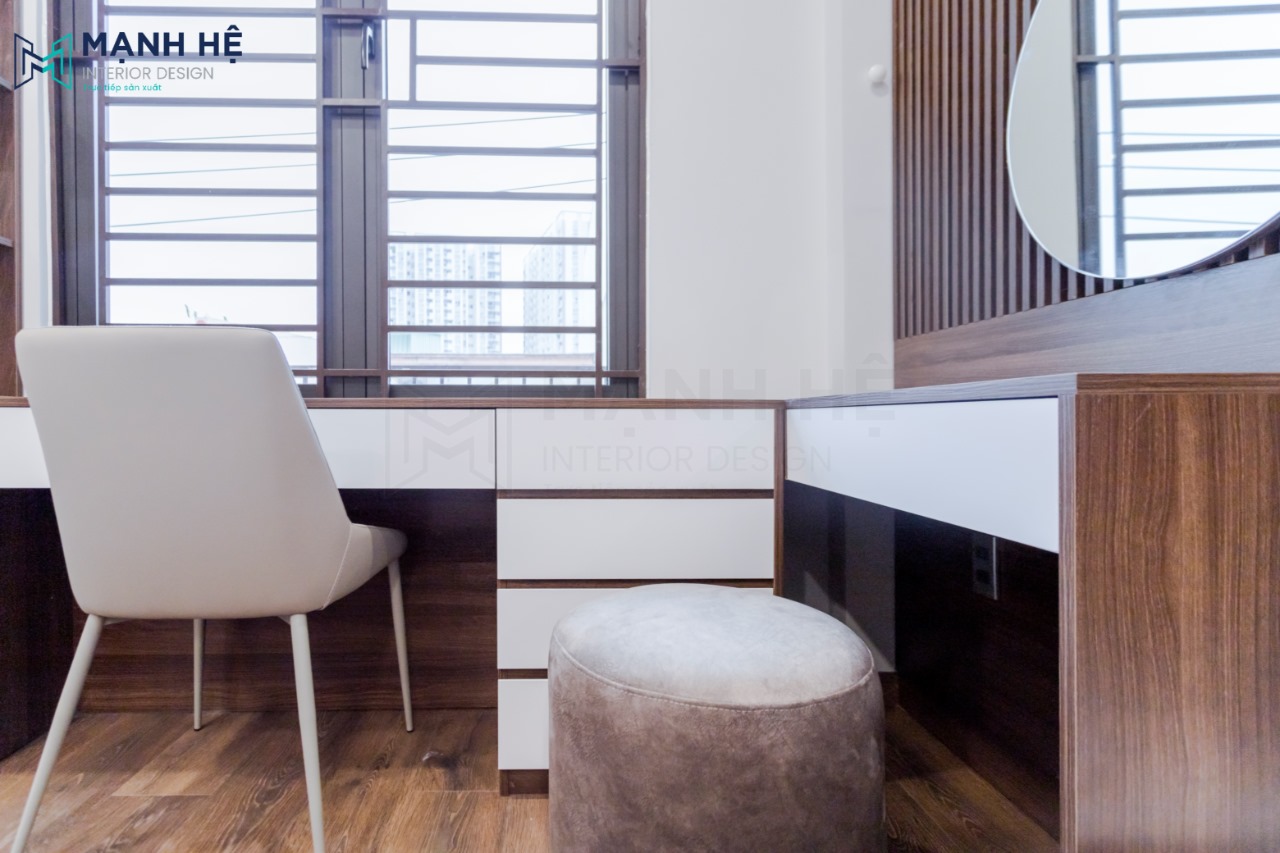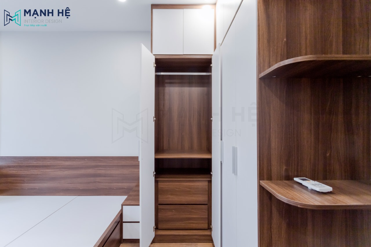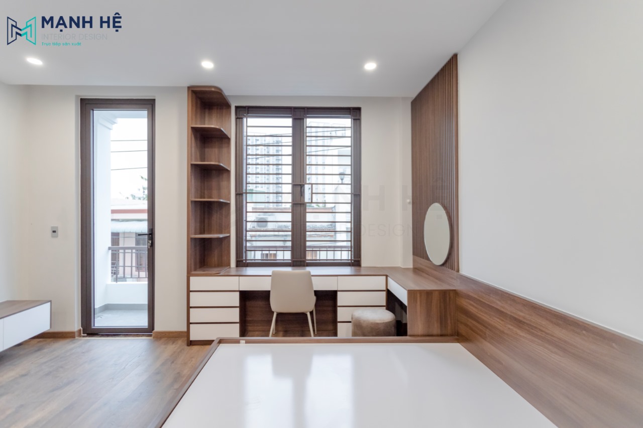 Phòng ngủ chọn gam màu nâu làm gam màu chủ đạo với nội thất gỗ công nghiệp đồng bộ màu. Thiết kế tủ quần áo cao đụng trần cánh mở tích hợp thêm các kệ trang trí, bàn làm việc kết hợp kệ sách treo tường màu trắng.
