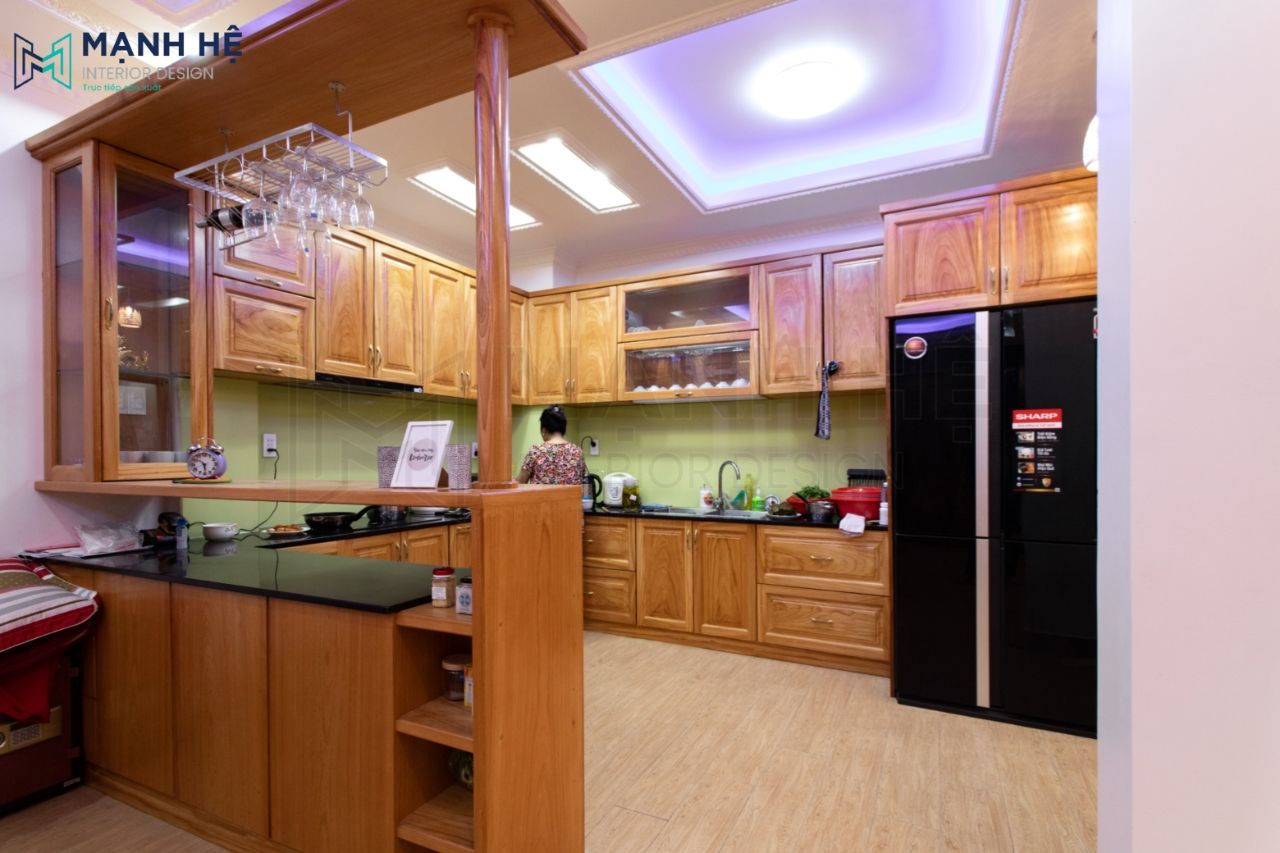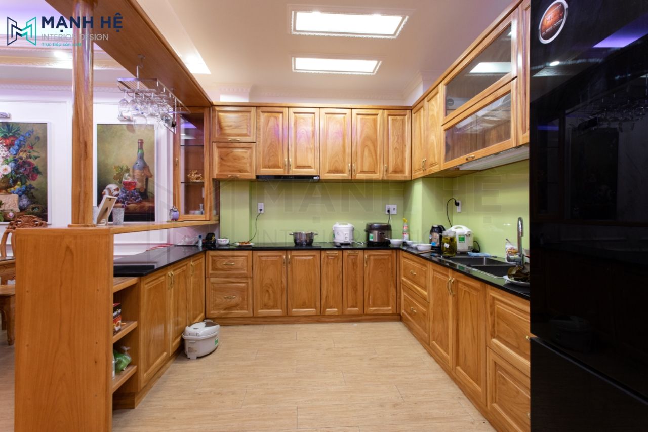 Tủ bếp gỗ tự nhiên chữ L với vân gỗ tự nhiên, tích hợp tủ bao tủ lạnh, các ngăn hộc tủ làm nơi lưu trữ chén bát và đồ khô cho gia chủ. Ốp kính màu xanh để thuận tiện khi lau chùi.