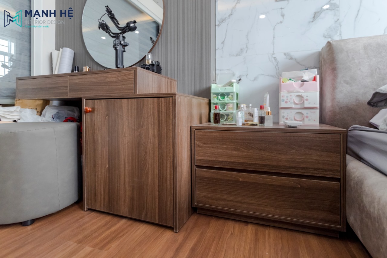 Bàn trang điểm và tab đầu giường được làm bằng gỗ công nghiệp đồng bộ với không gian