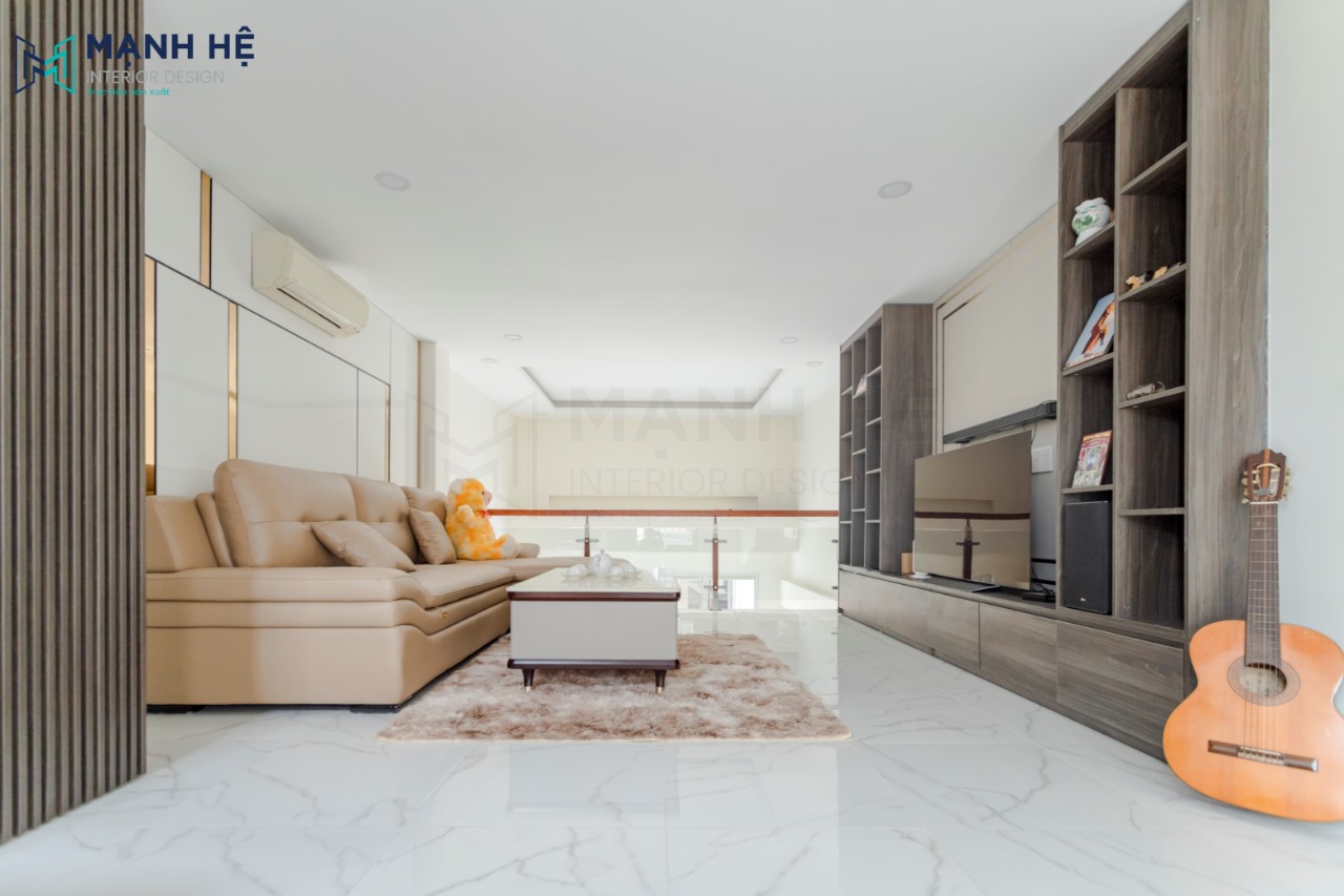 Thi công nội thất phòng khách sang trọng từ gỗ công nghiệp phủ melamine. Bộ ghế sofa đệm màu be đặt giữa phòng khách cùng bàn trà và thảm lót sàn tinh tế. Kệ tivi tích hợp chung tủ trang trí lớn với các ngăn hộc kích thước vừa phải làm nơi để các đồ trang trí yêu thích của gia chủ.