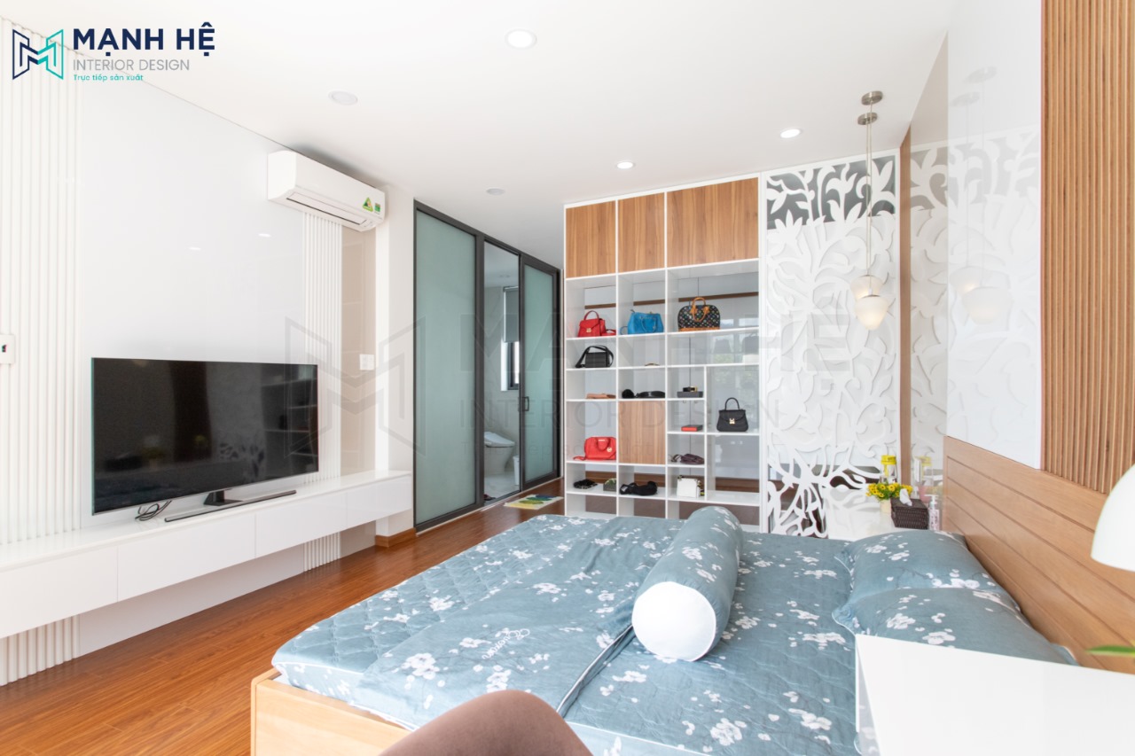 Tủ trang cao đụng trần gỗ công nghiệp sẽ giúp gia chủ tối ưu diện tích căn phòng nhất. Không gian các ngăn hộc tủ đủ để gia chủ lưu trữ túi xách, mỹ phẩm và các món đồ mà mình yêu thích. Vách ốp CNC phòng ngủ master phân cách phòng thay đồ thông minh.