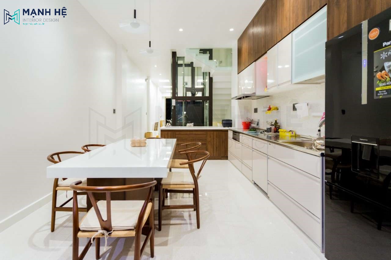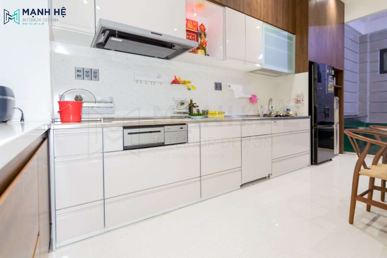 Gian bếp nhỏ vốn được coi là trái tim của mỗi ngôi nhà, hơn thế nữa là nơi gia đình sum họp , nơi giữ lửa. Vì vậy khi thi công nội thất Mạnh Hệ đã chăm chút tỉ mỉ đến từng chi tiết đem đến cho anh Dương gian bếp hiện đại, đẹp đến từng chi tiết. Không gian phòng bếp với tông màu trắng điểm thêm vào đó là màu gỗ trầm giúp không gian bếp trở nên nhẹn nhàng và ấm áp hơn.