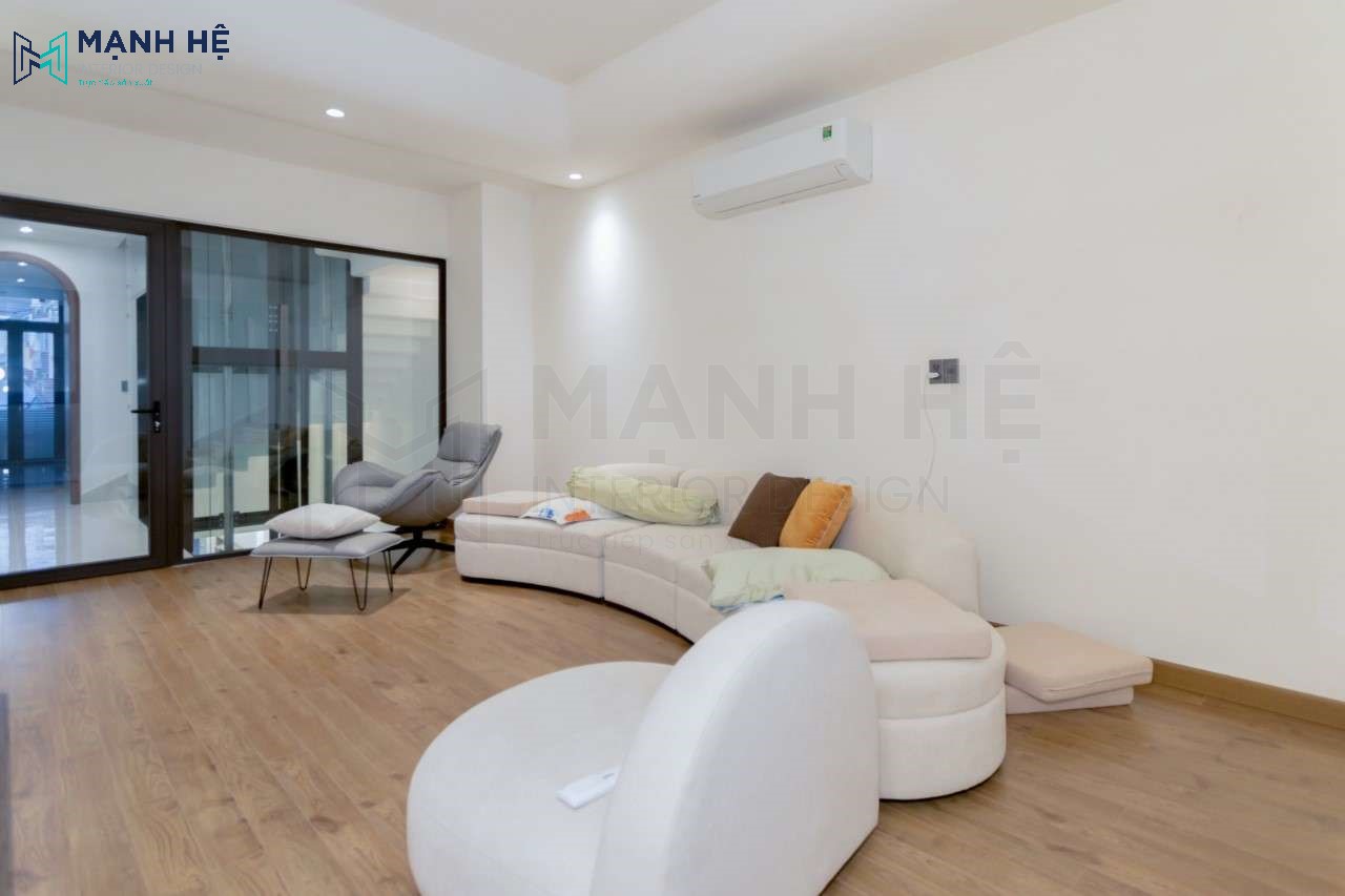 Phòng khách được thiết kế đơn giản, bố trí bộ sofa tông màu trắng tinh tế