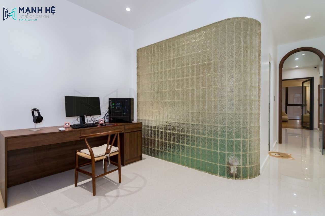 Với không gian làm việc gia chủ luôn mong muốn yên tĩnh, thoải mái. Hiểu được điều đó các KTS Mạnh Hệ đã đặt chiếc bàn làm việc riêng biệt với không gian nghỉ ngơi tăng thêm sự yên tĩnh và tập trung cho gia chủ. Cạnh bên là nhà vệ sinh sử dụng tường gạch kính bó góc độc đáo tạo điểm nhấn đặc biệt.
