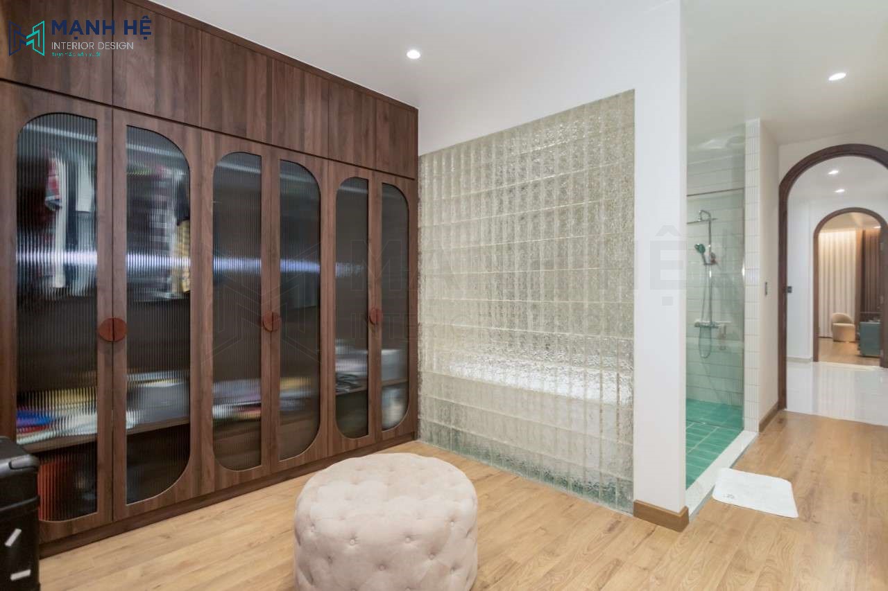 Phòng thay đồ được chăm chút tỉ mỉ với tủ quần áo gỗ công nghiệp cao đụng trần, sử dụn cánh kính mờ độc đáo. Cạnh bên là nhà tắm sử dụng gạch kính tạo nên bức tường kính vô cùng nổi bật và sang trọng.