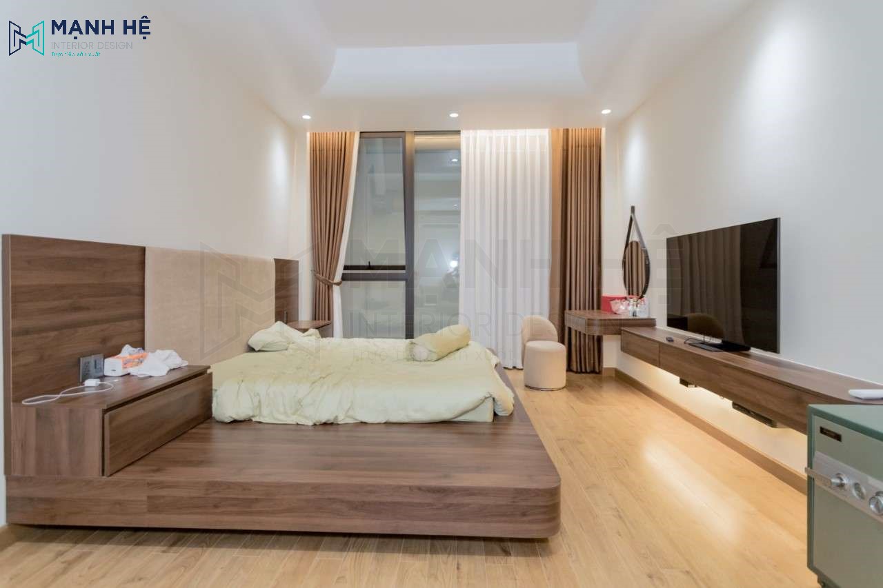 Thi công nội thất phòng ngủ Master với tông màu gỗ chủ đạo kết hợp với đó là tông màu trắng nhẹ nhàng tinh tế mang đế cho không gian phòng ngủ sự thoải mái, nhẹ nhàng hơn. Thiết kế bục đặt nệm bệt mang đậm phong cách Nhật Bản. Thiết kế rèm cửa 2 lớp tối ưu ánh sáng mỗi thời điểm cho không gian thêm thông thoáng và tươi sáng hơn.
