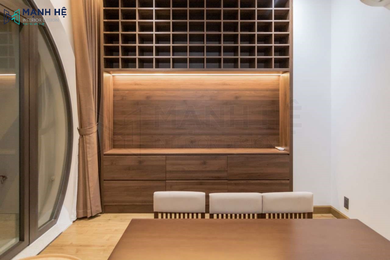 Hệ tủ lưu trữ với nhiều ô nhỏ giúp gia chủ thoải mái trưng bày rượu hay bộ sưu tập riêng của mình