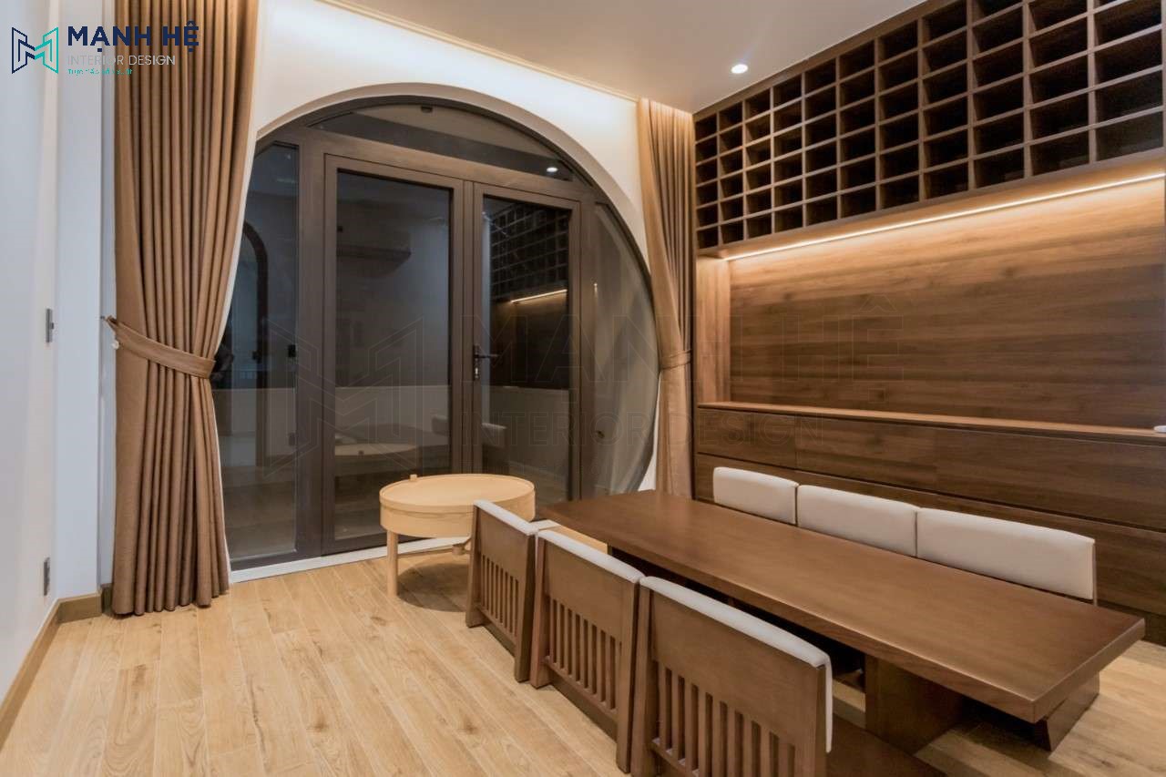 Phòng sinh hoạt chung nơi các thành viên gia đình tụ họp trò chuyện, vui đùa cùng nhau được Mạnh Hệ chú trọng và họa rõ nét phong cách Nhật Bản từ những vật dụng nhỏ như bộ bàn uống trà, cửa ra vào hay hệ tủ trang trí. Tổng quan không gian này được thi công bằng chất liệu gỗ công nghiệp với tông màu trầm tạo cảm giác ấm cúng.