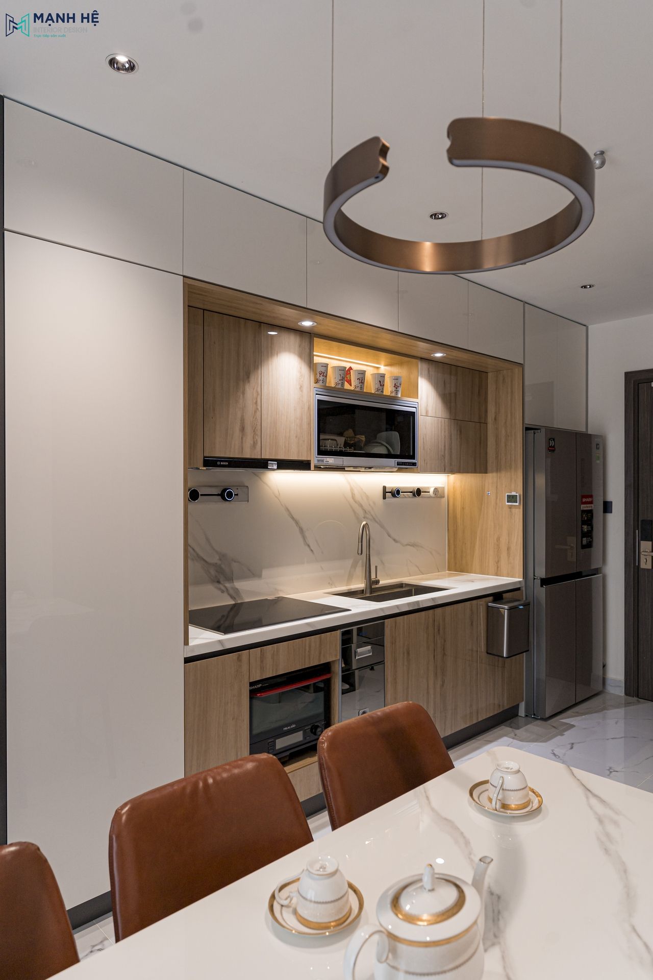 Không gian bếp được Mạnh Hệ thi công đồng bộ với khu vực phòng khách, tạo nên tổng thể liền mạch và hiện đại. Hệ tủ bếp chữ I sử dụng gỗ công nghiệp phủ Acrylic bóng gương, kết hợp gam màu vân gỗ ấm áp, mang lại cảm giác sang trọng nhưng gần gũi. Mặt bếp và đá ốp bếp vân mây được gia công chính xác, các chi tiết bo viền, bản lề và đèn hắt sáng đều được hoàn thiện tỉ mỉ và tinh gọn.