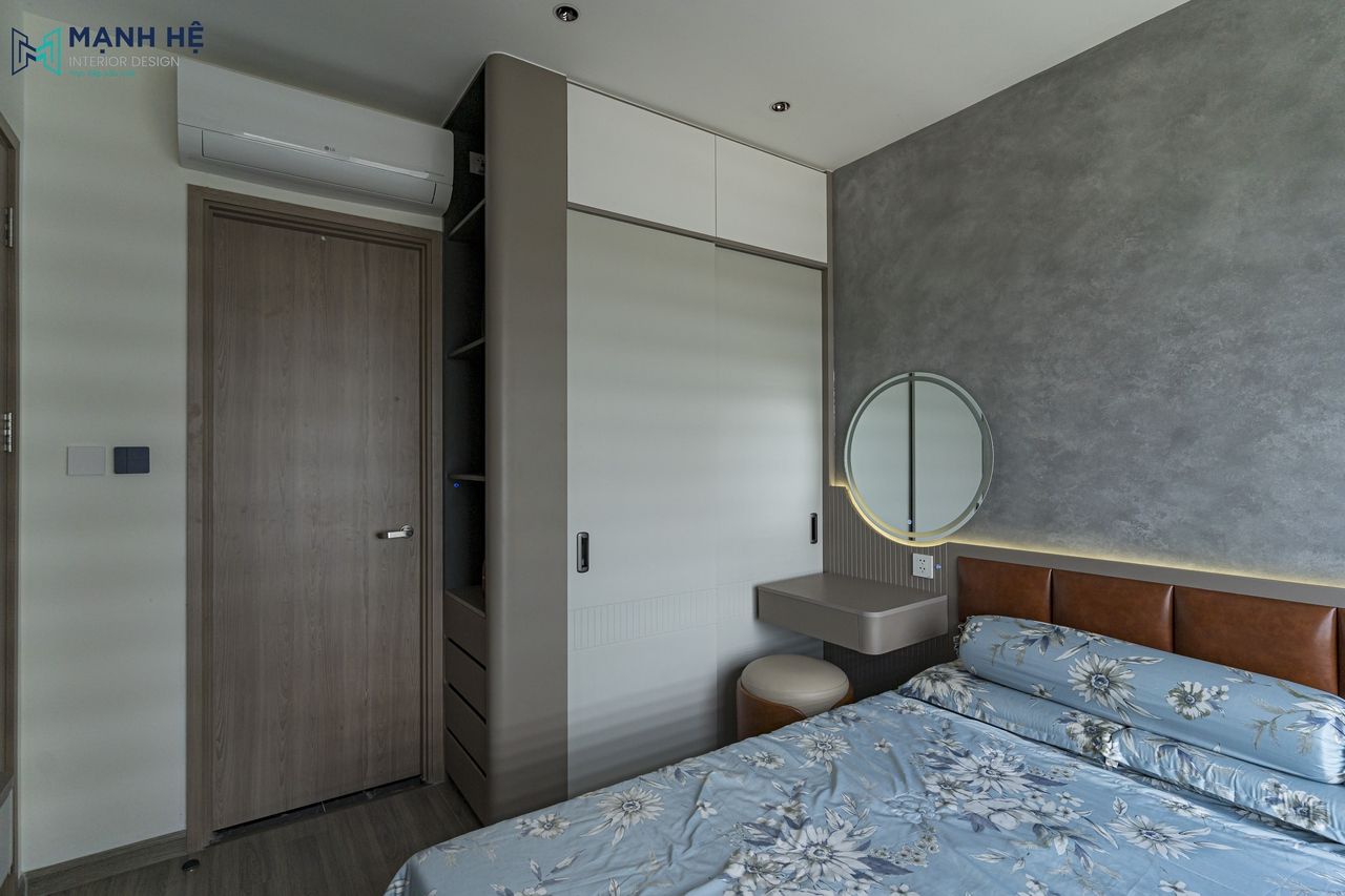 Phòng ngủ phụ được hoàn thiện với tinh thần tối giản, tập trung vào sự gọn gàng và tính thực tế trong sinh hoạt. Mảng tường đầu giường sử dụng sơn hiệu ứng xi măng tương tự phòng ngủ master. Điểm nổi bật của căn phòng nằm ở hệ tủ quần áo liền bàn làm việc được thi công liền khối, kết hợp phần bo cong ở góc bàn được xử lý mềm mại, vừa tăng tính an toàn khi sử dụng vừa tạo điểm nhấn tinh tế cho không gian.