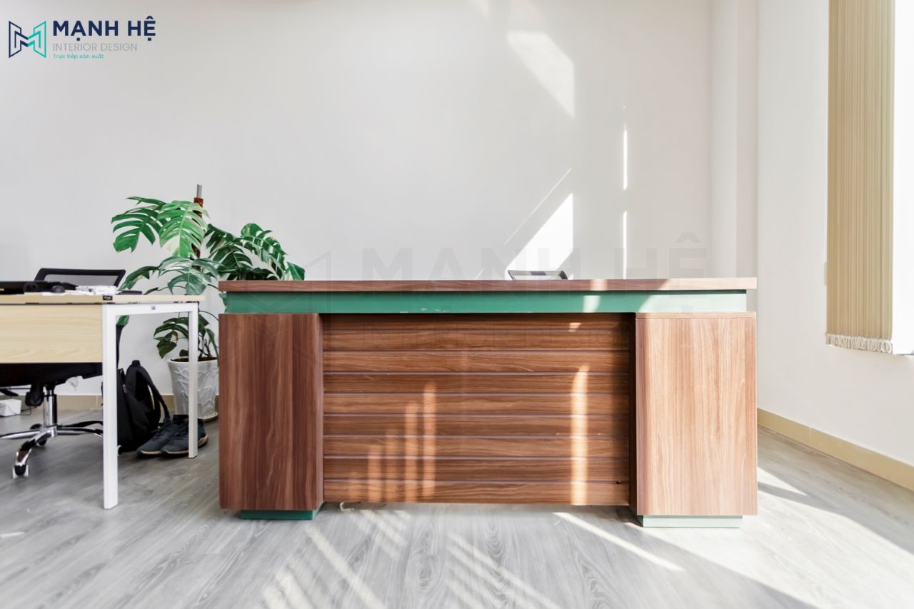 Bàn làm việc của giám đốc với màu nâu kết hợp màu xanh nổi bật