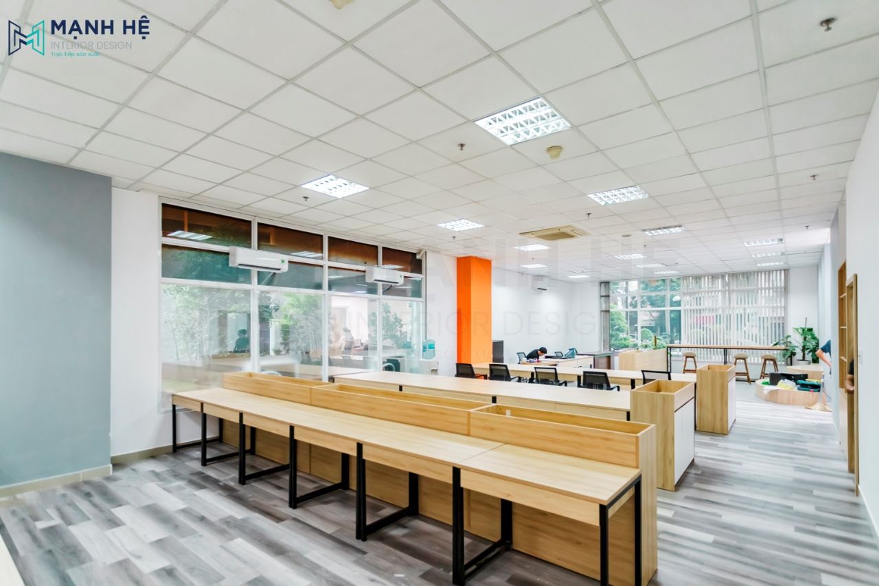 Tổng thể không gian làm việc cho nhân viên rộng lớn với nội thất tiện nghi