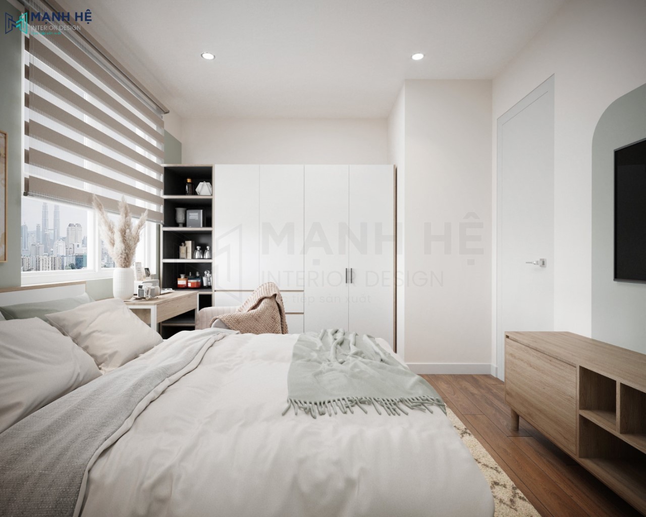 Phòng ngủ chung cư được kết hợp giữa gam màu trắng và xanh lam nhạt làm gam màu chủ đạo mang đến cảm giác tươi mát, dễ chịu, là một căn phòng chuẩn mực, đúng gu để nghỉ ngơi, thư giãn của gia chủ. Phòng ngủ có giường gỗ chắc chắn, bàn gỗ nhỏ được đặt kế bên đối diện cửa sổ giúp cho phòng ngủ gọn gàng.