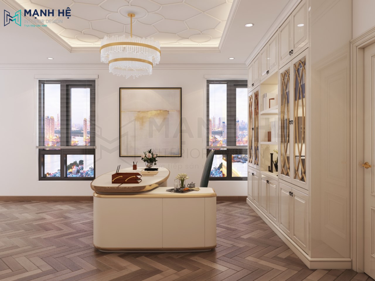 Bàn làm việc chữ L được làm bằng gô tự nhiên trắng acrylic màu kem đồng bộ với tủ hồ sơ. Mặt bàn hình Ovan độc đáo, các góc cạnh mạ vàng sang trọng, cùng concept với nội thất căn phòng.
