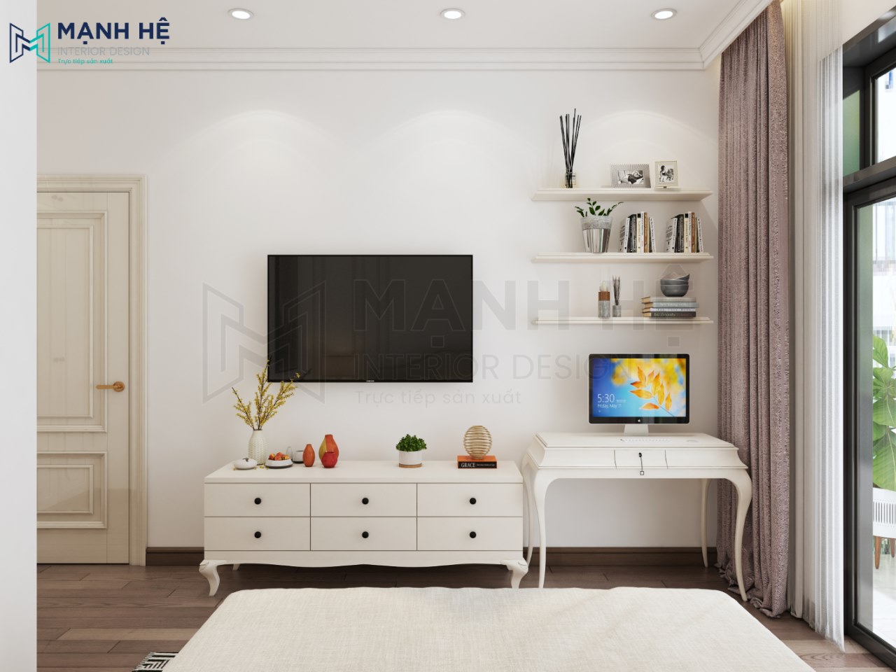 Kệ ti vi cùng bàn học làm bằng gỗ tự nhiện sơn trắng đồng bộ với tone màu chung của căn phòng. Chân bàn thiết kế cong lượn quyến rũ. Rèm cửa hai lớp che chắn ánh nắng gay gắt trực tiếp chiếu vào những buổi trưa nóng bức