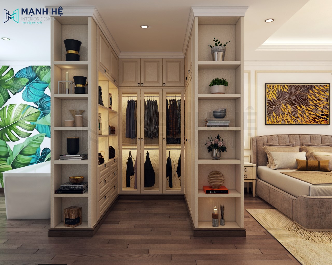 Tủ quần áo kết hợp kệ trưng bày được thiết kế hình chữ U độc đáo, sử dụng như một vách ngăn các không gian