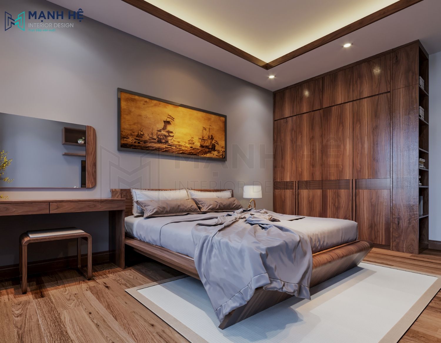 Thiết kế nội thất phòng ngủ khá đơn giản khi chỉ được bố trí các vật dụng cần thiết nhất như giường, tủ đồ, bộ bàn ghế đơn trang điểm, 1 bức tranh, 1 chiếc thảm. Nắm bắt được tâm lý của vị khách hàng này, chúng tôi đã bố trí một chiếc giường bằng gỗ tự nhiên khá rộng rãi có màu nâu gỗ đi kèm đó là bộ chăn ga gối nệm màu xám khá sạch sẽ và tinh tế.