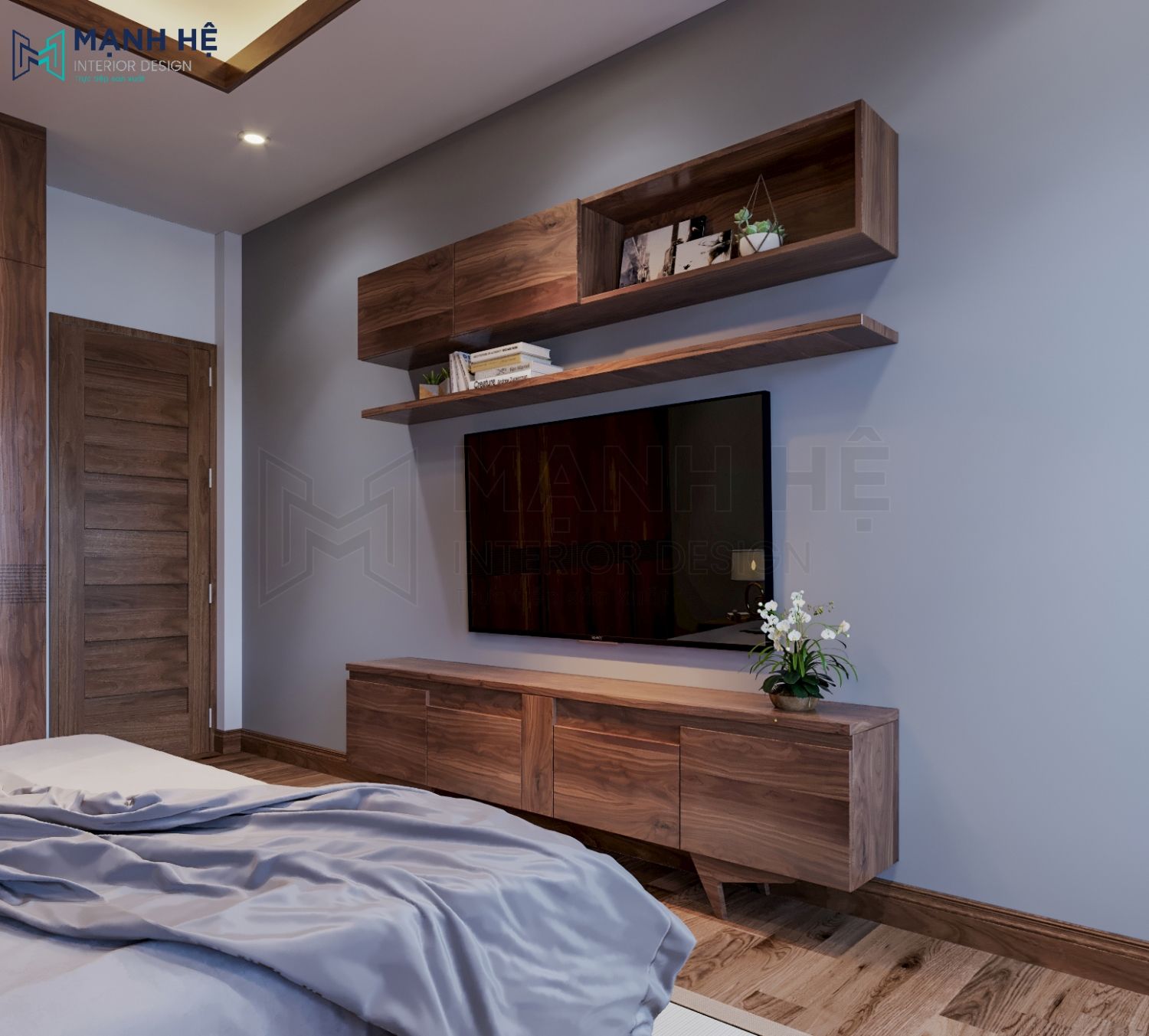 Không gian phòng ngủ được trang bị thêm bô tủ kệ tivi
