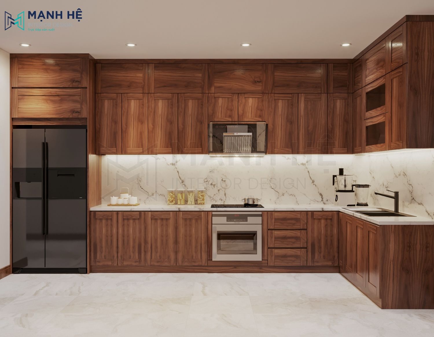 Hệ thống tủ bếp hình chữ L khá sang trọng
