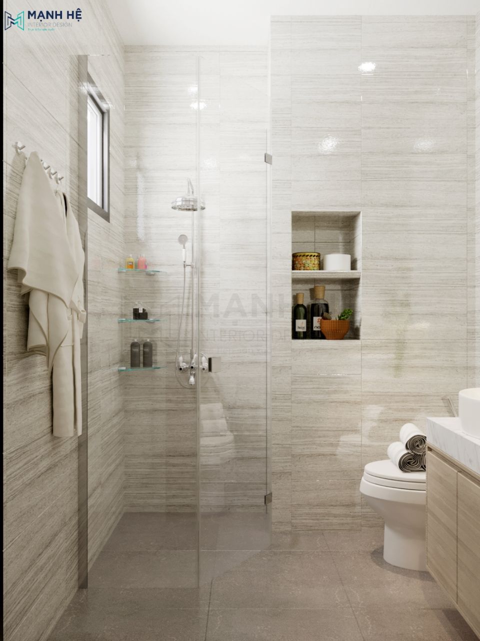 Nhà vệ sinh thường được sử dụng các loại gạch sàn chống trượt và vách tường thường được ốp gạch sát trần. Vì tránh nước thấm vào tường sơn sẽ dễ gây bong tróc. Đồng thời, tủ đựng vật dụng cá nhân trong nhà vệ sinh cũng được lựa chọn kĩ, chất liệu phải chống nước để tránh hư hỏng.