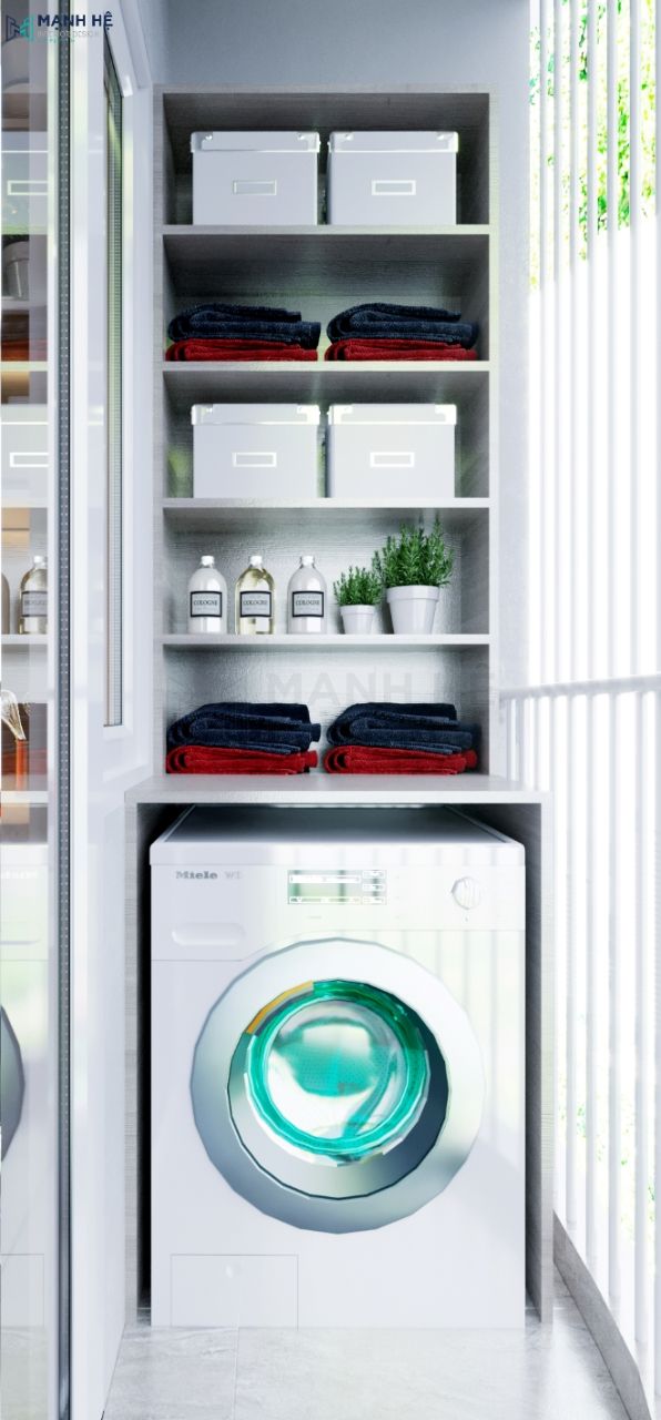 Vì diện tích nhà nhỏ, các kiến trúc sư đã tận dụng triệt để ban công để đựng máy giặt. Nhưng vẫn rất tinh tế khi có ngăn chứa máy giặt, tránh khỏi các tác nhân nắng mưa dễ làm hư hỏng máy giặt.