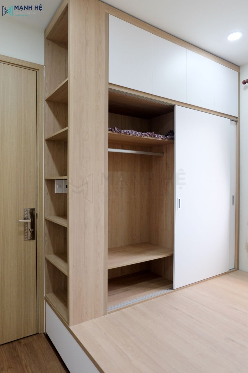 Giường ngủ bục có hộc kéo giúp cho gia chủ có thêm diện tích cất trữ đồ một cách gọn gàng và ngăn nắp. Cũng như, chiếc giường được tích hợp tủ quần áo cửa lùa đụng trần, tận dùng tối đa không gian căn phòng.