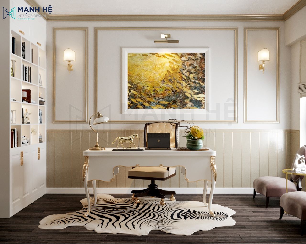 Tổng thể không gian phòng làm việc với điểm nhấn là bàn làm việc có kiểu dáng sang trọng