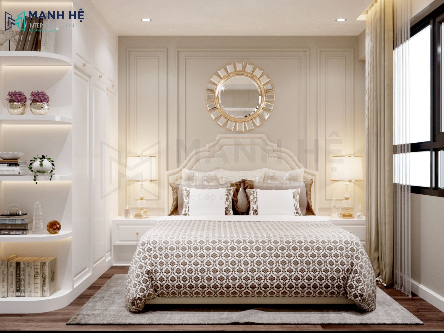 Phòng ngủ được bố trí giường ngủ lớn màu trắng bằng gỗ tự nhiên, đầu giường sơn màu be sữa có sử dụng đường chỉ gỗ ốp tường, gương trang trí lớn. Đèn ngủ sang trọng với thiết kế theo phong cách tân cổ điển màu trắng điểm vàng quen thuộc.