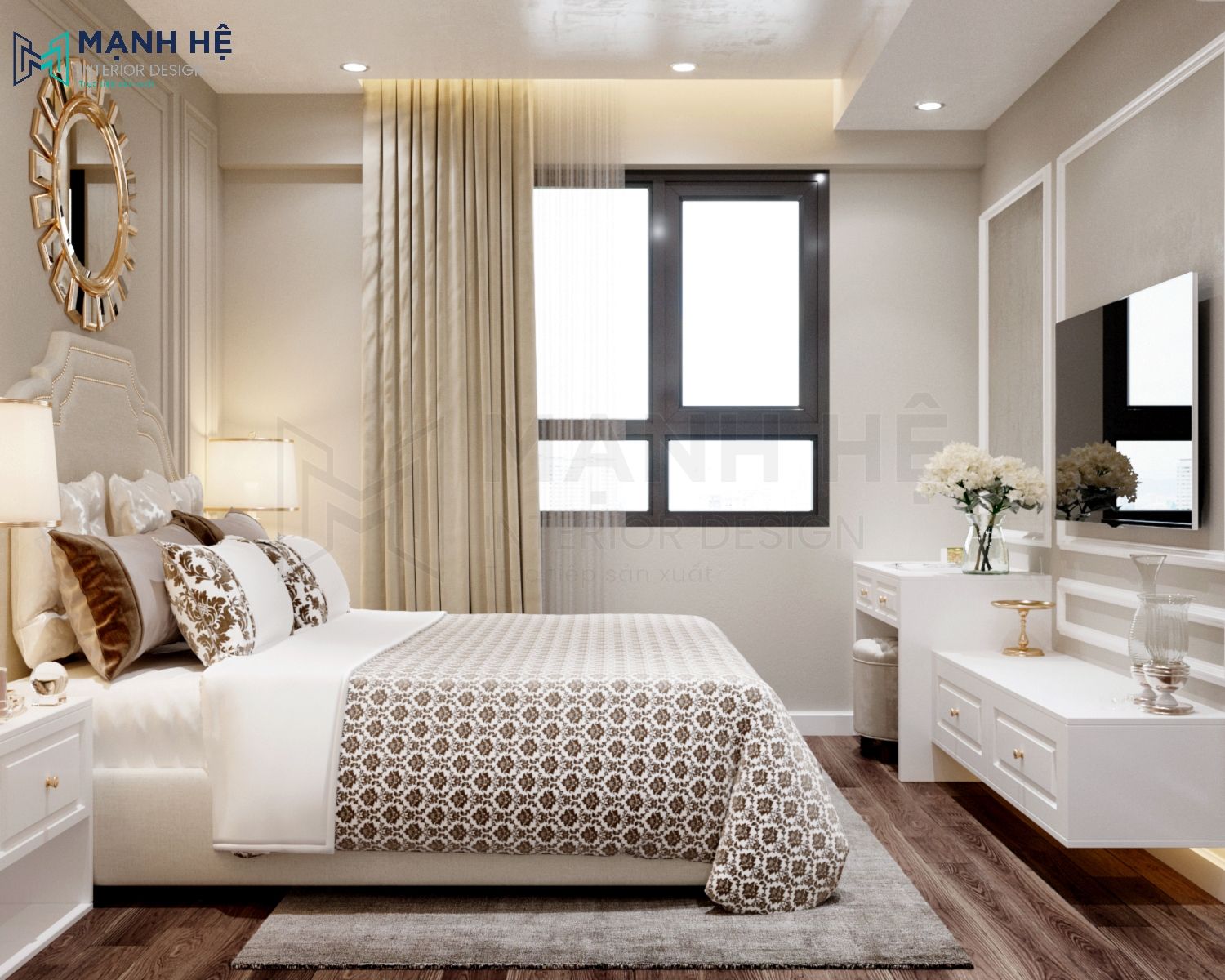 Phòng ngủ được bố trí cửa sổ lớn có rèm cửa, tủ quần áo 3 cánh thiết kế âm tường kèm kệ góc trang trí. Sàn phòng ngủ gỗ tự nhiên được trải thảm sẽ giúp căn phòng thêm sang trọng, mang lại cảm giác thoải mái, mát mẻ hơn, làm dịu nhẹ đi cái nắng oi bức của tiết trời Sài Gòn.