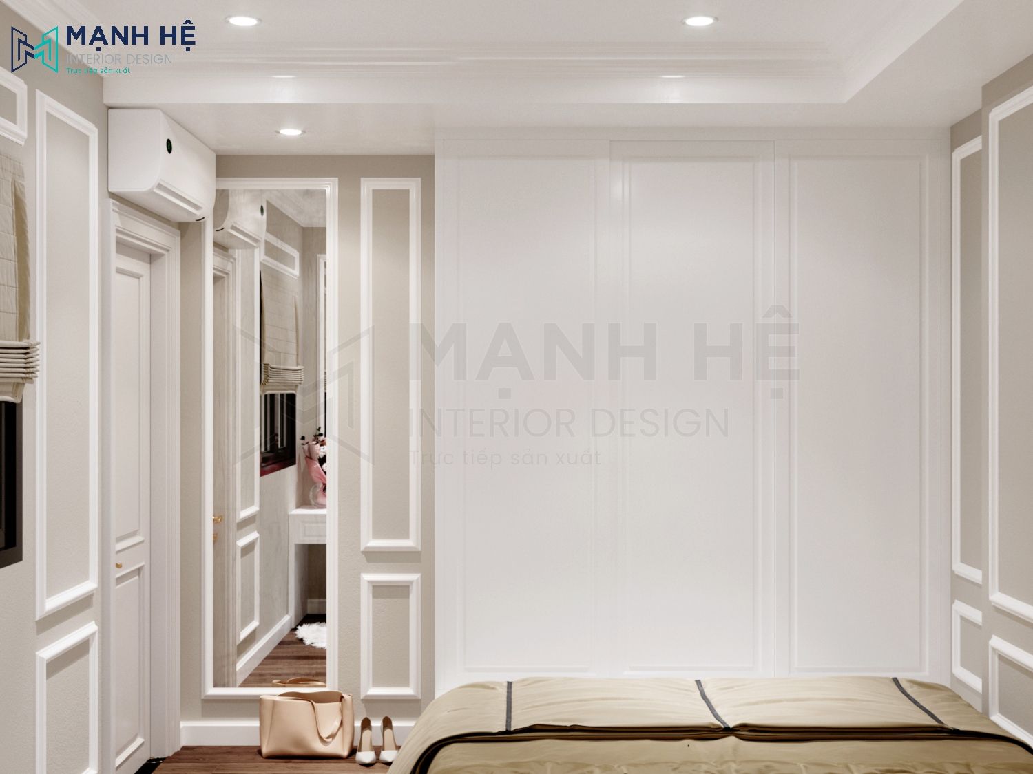 Tủ quần áo âm tường thiết kế liền ngay cuối giường với diện tích lớn, như vậy căn phòng sẽ có thêm nhiều không gian lưu trữ bên trong để bên ngoài luôn gọn gàng, thoáng mát. Lắp thêm giương lớn ngay tủ quần áo tạo ra không gian thay đồ hợp lí.