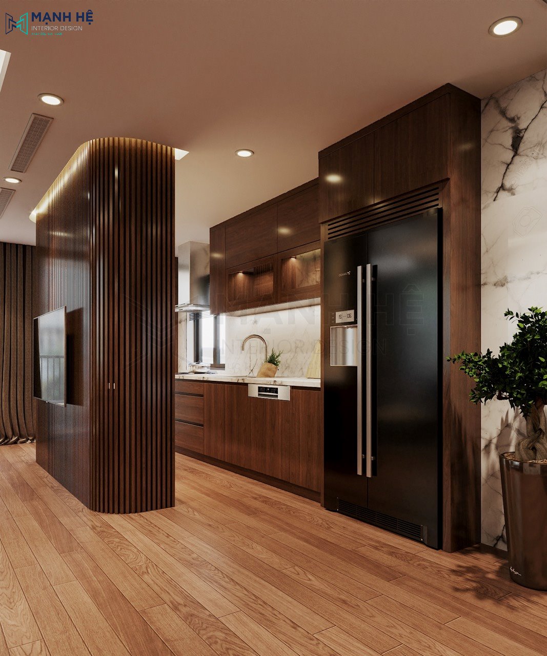 Thực tế là với những căn nhà có diện tích lớn thì có thể tách riêng phòng bếp và phòng khách là hai không gian độc lập. Tuy nhiên, trong trường hợp của anh Quý thì theo yêu cầu của anh là muốn có không gian mở nên chúng tôi đã thiết kế một vách ngăn đa chức năng giữa phòng khách và phòng bếp, giúp tiết kiệm diện tích trong khi vẫn có một không gian lớn cho cả căn nhà.
