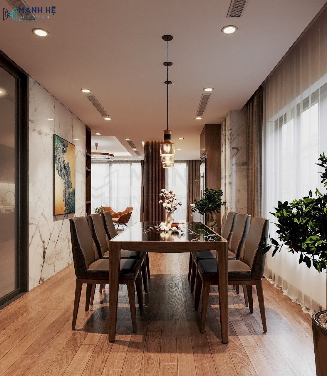 Bàn ăn mặt đá chữ nhật vân mây thon gọn với bộ 6 ghế ngồi. Không gian phòng ăn khá thoáng và tách biệt với phòng bếp. Với đặc thù của phòng ăn là ít sử dụng nhiều đồ nội thất nên các kiến trúc sư nội thất Mạnh Hệ đã dùng nhựa có hoa văn vân đá cẩm thạch để ốp tường và trang trí bằng bức tranh nghệ thuật thêm phần sinh động.