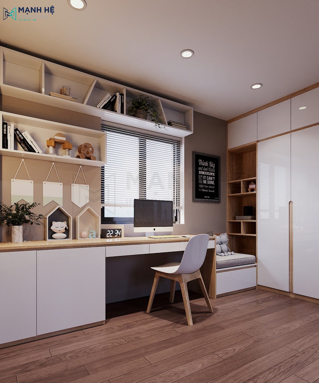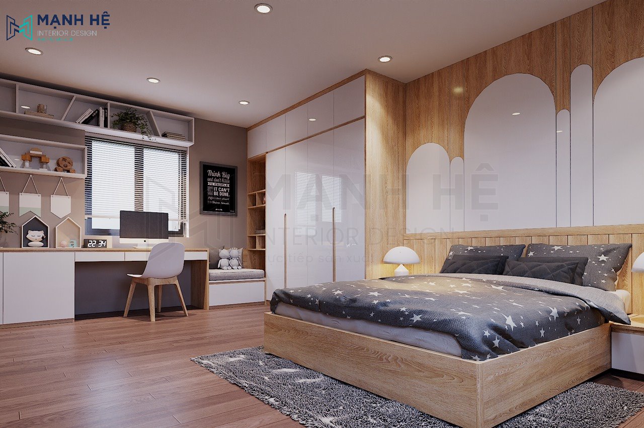 Tủ quần áo gỗ công nghiệp cánh mở 4 buồng phủ Acrylic sáng bóng, bên hông có các ngăn đựng đồ. Bàn học được đặt ngay cửa sổ, tận dụng ánh sáng tự nhiên tạo cảm hứng học tập, sáng tạo.