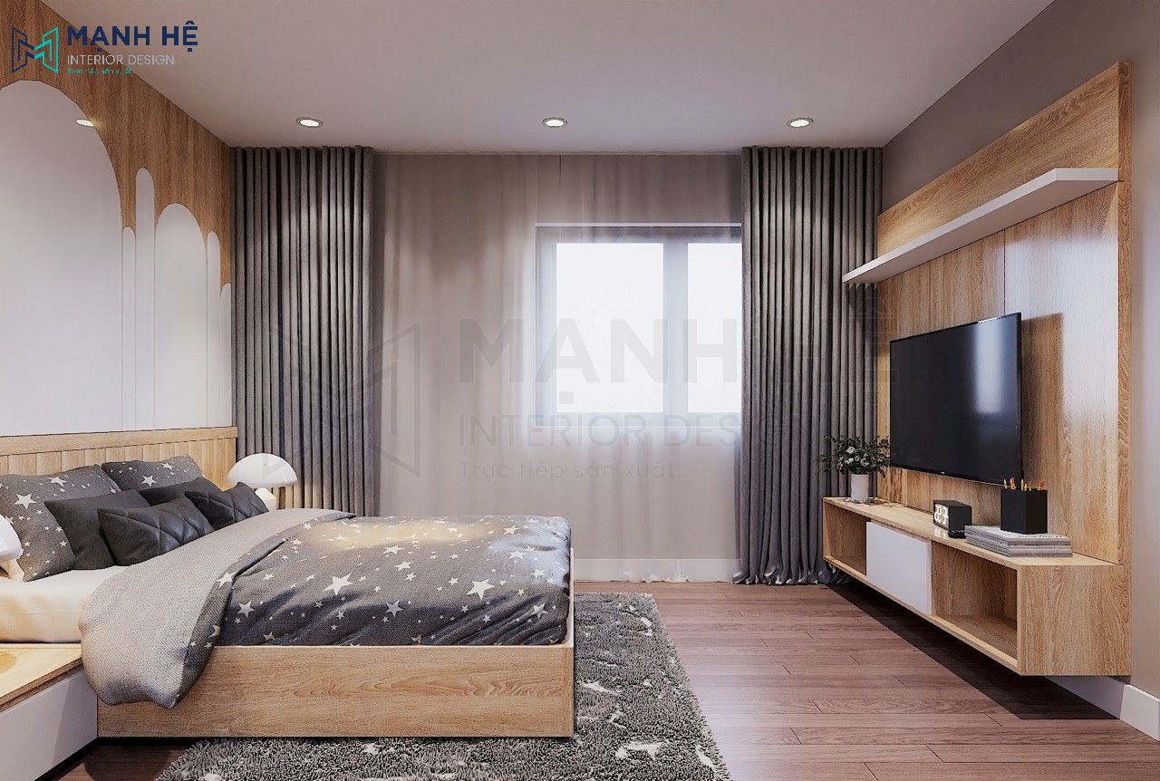 Căn phòng ngủ đầy đủ tiện nghi cho con gái anh Quý, kệ ti vi gỗ công nghiệp cùng với giường ngủ gầm thấp tạo thành một tổng thể hòa quyện với nhau.