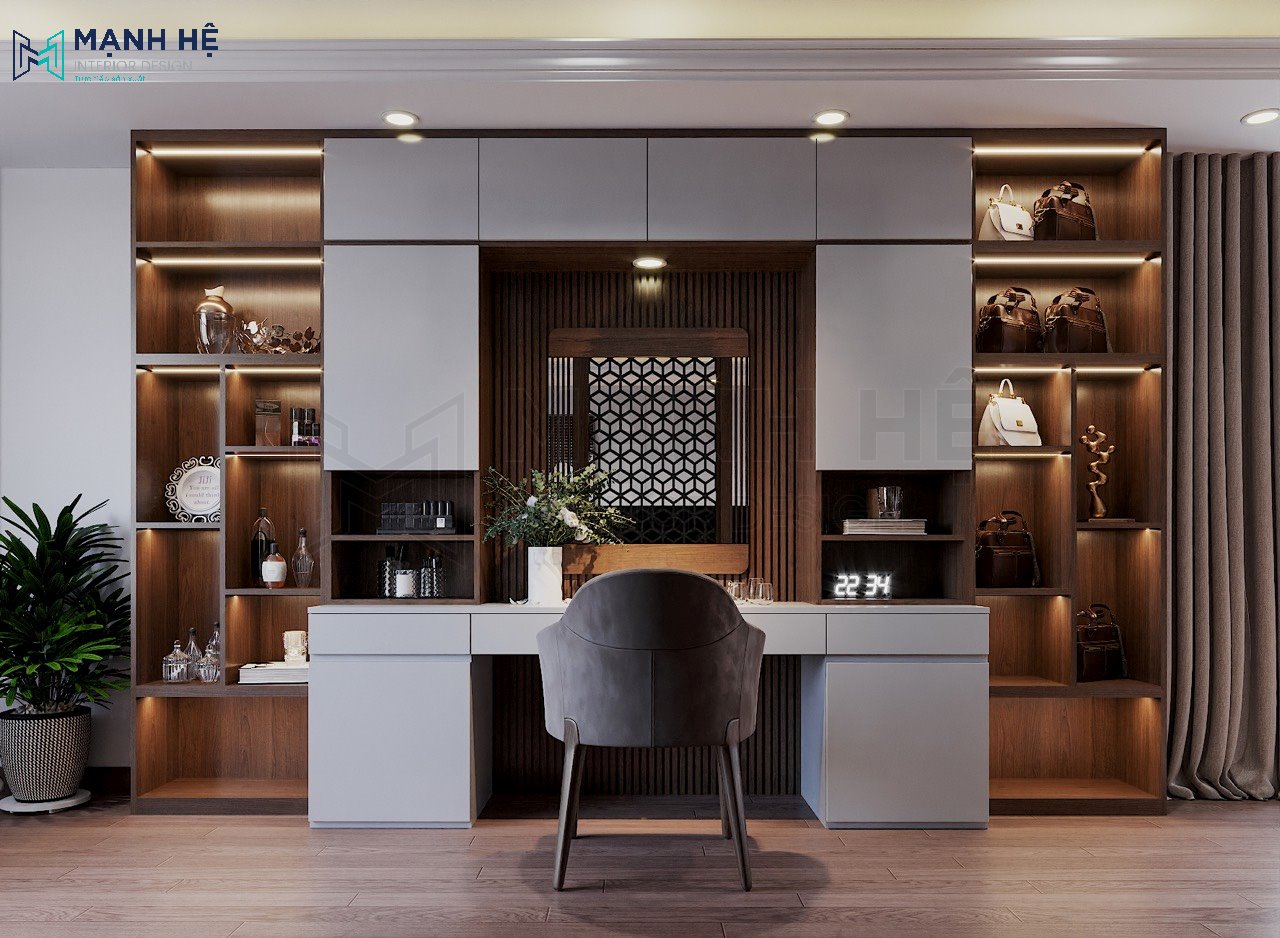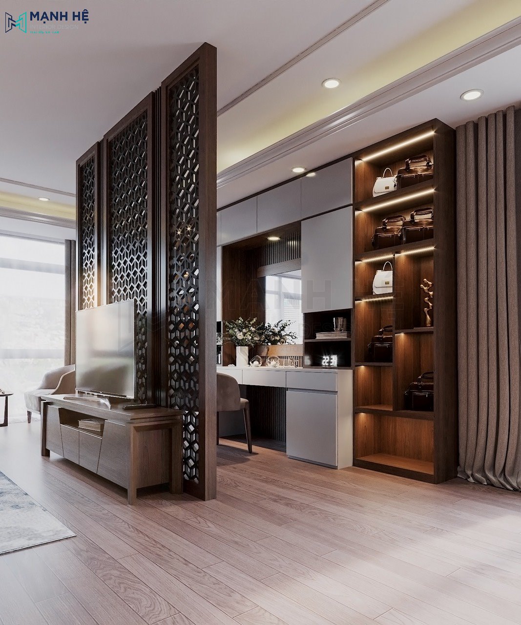 Sự kết hợp khá thú vị giữa phòng ngủ, không gian trưng bày và bàn trang điểm, vách ngăn phân chia 2 khu vừa tinh tế vừa riêng tư.