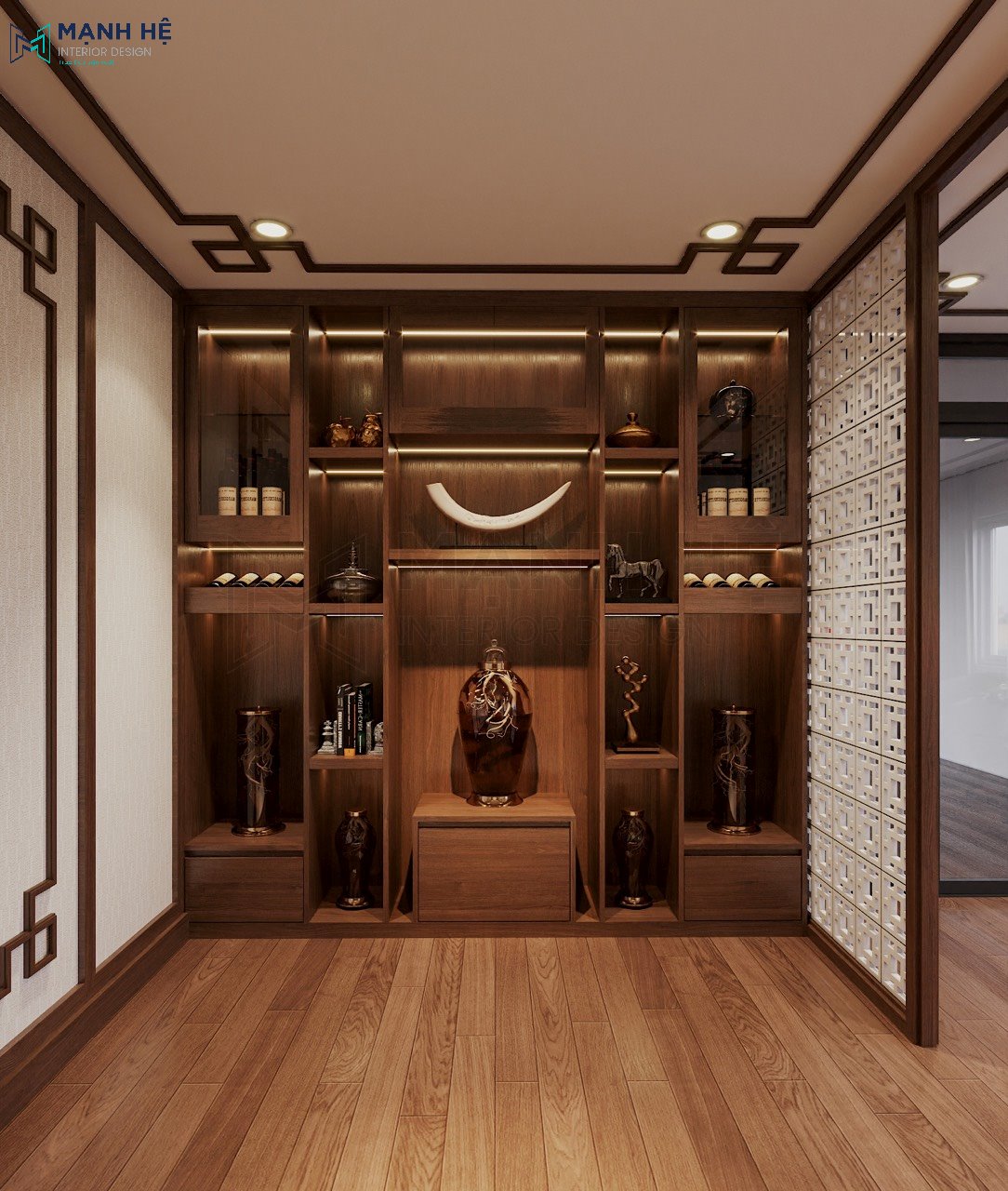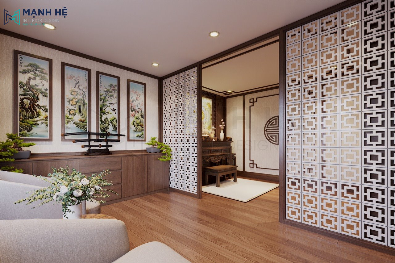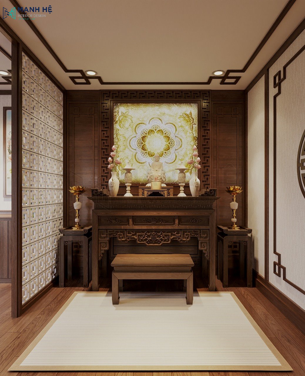 Không quá cầu kỳ trong cách thiết kế từ chất liệu cho đến chọn màu, bàn thờ phật và gia tiên vẫn vô cùng thiêng liêng. Sử dụng gỗ màu tối và màu trầm để làm tủ thờ, vách ngăn khắc công nghệ cao tinh tế.