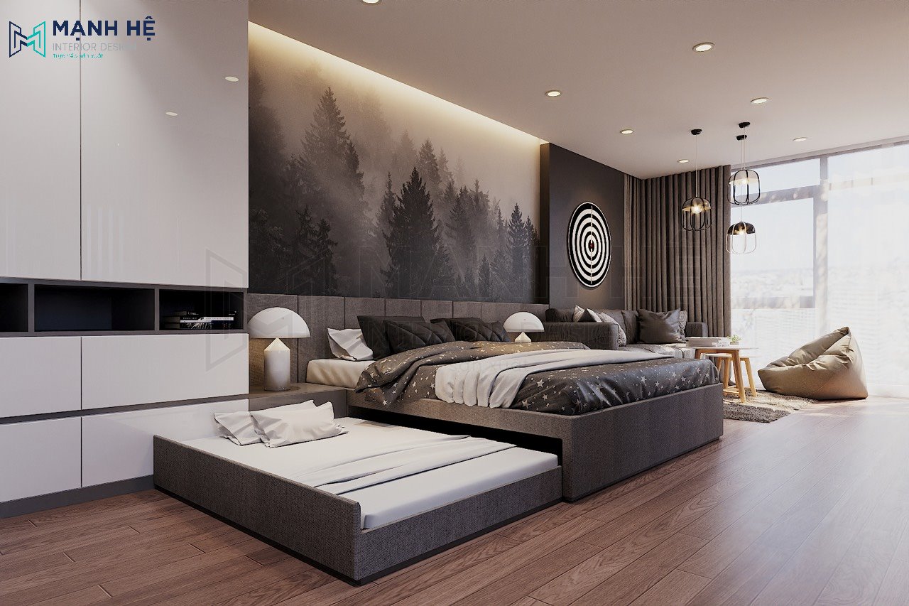Thay vì sử dụng những vách tường trơn đơn điệu thì chúng ta có thể phá cách bằng miếng dán tường có hình nghệ thuật, tạo khung cảnh “siêu thực” như đang bước vào khung cảnh đó. Giường ngủ giật cấp 2 tầng thông minh tiết kiệm diện tích và tăng sức chứa.