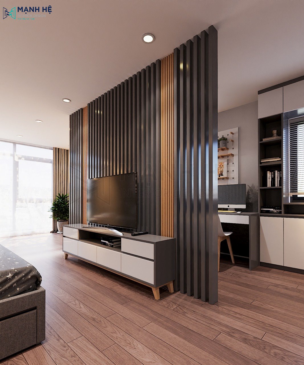 Kệ ti vi gỗ công nghiệp 4 chân vững chãi. Vách ngăn dạng sọc đứng tạo cảm giác chiều cao cho căn phòng, không làm mất đi tính liên kết.
