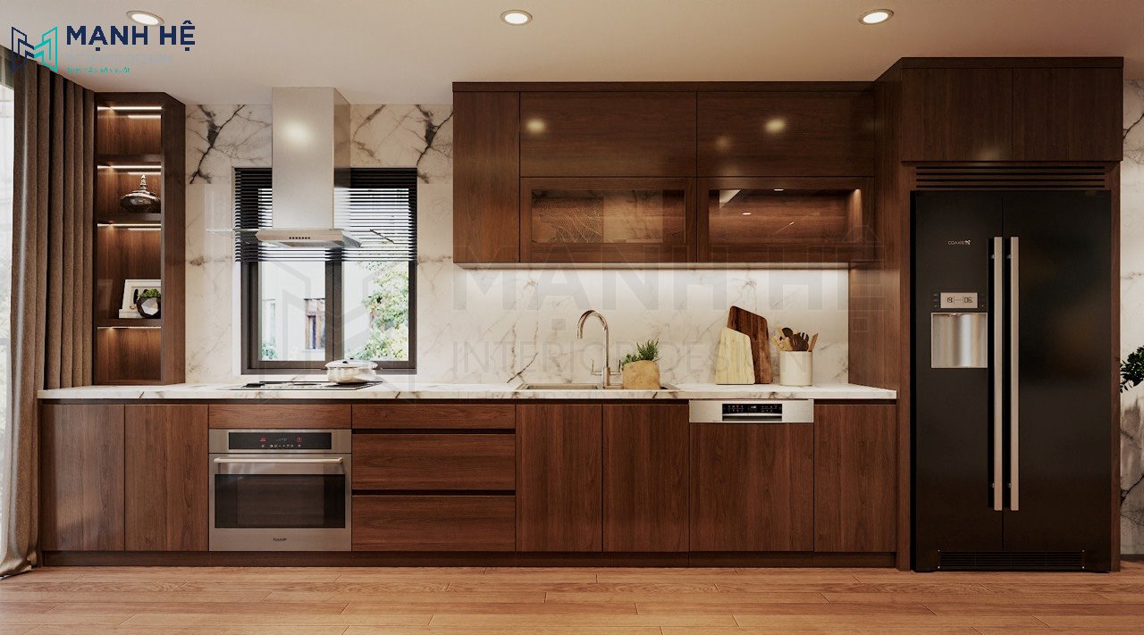 Một không gian mở với cách bố trí khoa học sẽ là giải pháp hoàn hảo nhất, vừa đáp ứng được nhu cầu nấu nướng lại vừa đảm bảo được tính thẩm mỹ cao cho ngôi nhà.Nội thất phòng bếp và phòng ăn liên thông với nhau, không có sự phân định rạch ròi, đảm bảo sự thông thoáng và khoáng đạt cho không gian sống của gia đình.