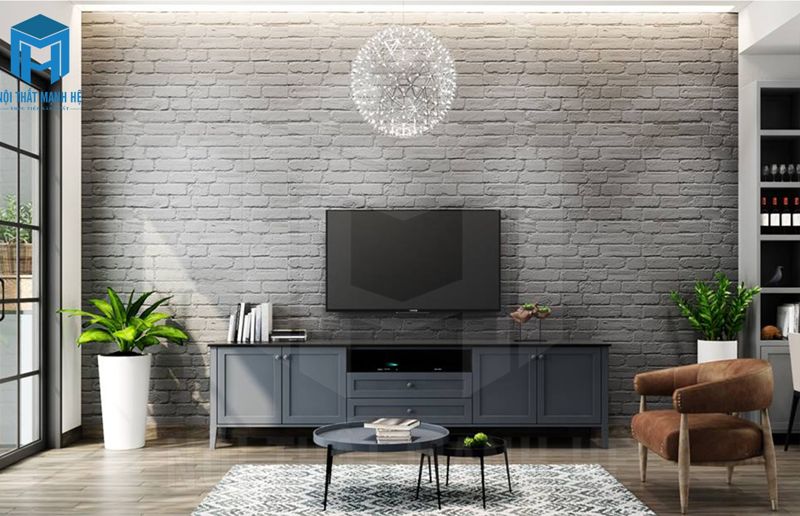 Nội thất phòng khách được thiết kế theo phong cách hiện đại, pha một chút cổ điển nhấn nhá từ chiếc ghế sofa đơn, bàn trà nghệ thuật. Kệ ti vi bằng gỗ, sơn phủ màu xám ghi cho căn nhà thêm bắt mắt. Đặc biệt là sự trang trí với thảm và sử dụng ti vi gắn tường giúp căn nhà được tiết kiệm tối đa không gian.