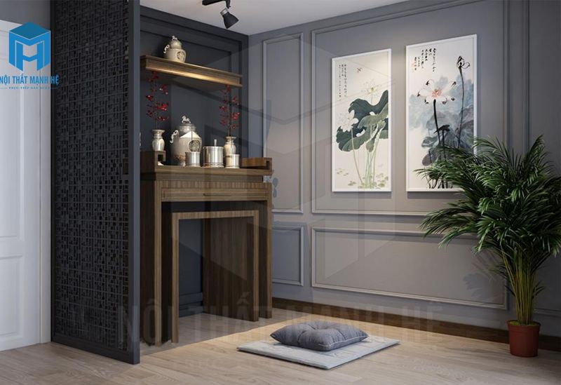 Tạo một không gian thờ cúng trong nhà đúng phong thủy và tôn nghiêm là vấn cần lưu tâm. Đa phần các khách hàng thích đặt phòng thờ ngay tại phòng khách. Phòng thờ được ngăn bởi vách ngăn gỗ, kết hợp với vài bức tranh trang trí đặt trong một không gian tủ thờ trang nghiêm. Tất cả tạo nên một không gian thực sự ấm cúng.