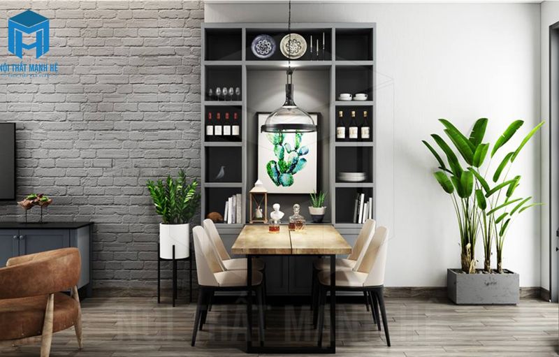 Bàn ăn được đặt ngay cạnh tủ tivi, trang trí với các chậu cây xanh và đặt một tủ rượu kèm kệ trang trí hay tủ sách khi bạn cần. Trang trí thêm một khung tranh nghẹ thuật ở giữa tủ ô kệ cũng làm tăng sự nổi bật cho không gian ăn uống mỗi ngày.