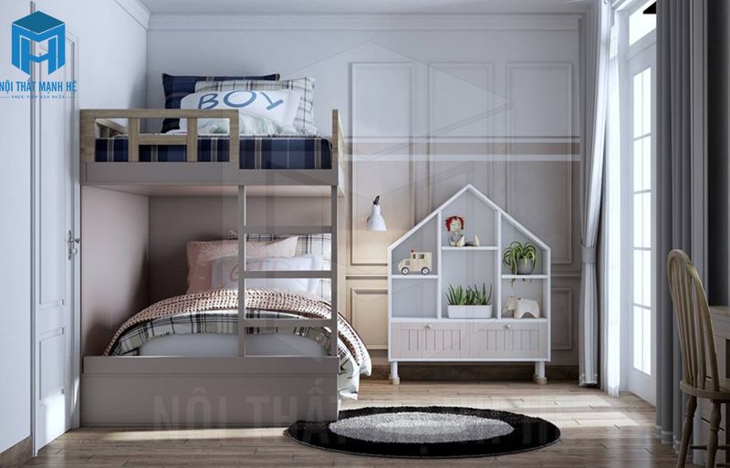 Một không gian cực kì thích hợp với các bé sinh đôi, nhưng nếu là các bé gần độ tuổi thì cũng thật tuyệt vời khi chúng được sinh hoạt và vui chơi trong cùng một căn phòng. Thiết kế giường tầng giúp tiết kiệm không gian, gắn thêm một chiếc thảm tròn cũng làm căn phòng thêm rộng hơn. Một tủ trang trí nhỏ gọn bên góc tường cũng giúp các bé thêm những giấc ngủ ngon trong căn phòng của mình.