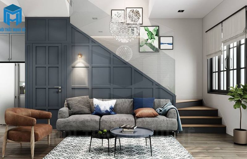 Toàn bộ không gian nhà đều được thiết kế tiết kiệm tối đa diện tích và tận dụng khoảng trống. Đặc biệt là tận dụng chân cầu thang phía sau bộ sofa để làm tủ đựng đồ, nhà kho nhỏ thích hợp cho những vật dụng không dùng tới.