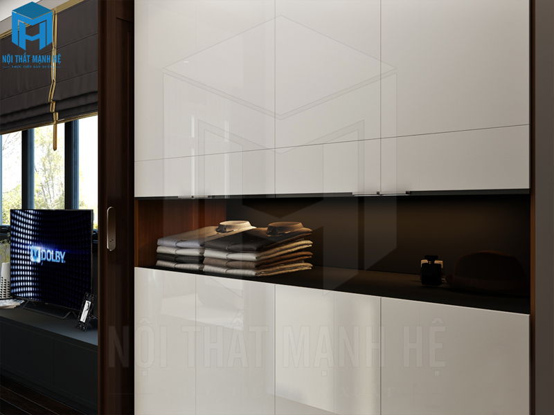 Tủ gỗ phủ acrylic đẹp và hiện đại dùng để đựng đồ. Điểm độc đáo của chiếc tủ này là thiết kế thêm một phần mặt cửa kính độc đáo. Có thể vừa đựng đồ vừa trang trí vài món đồ yêu thích.