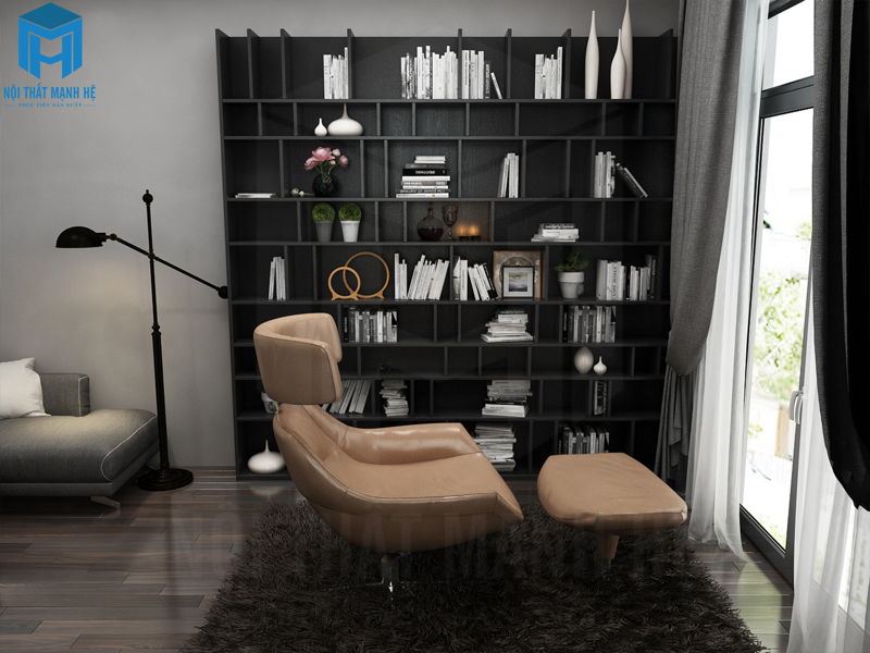 Đặt một chiếc ghế thư giãn tại phòng sách sẽ giúp gia chủ vừa ngập tràn trong kho tàng kiến thức vừa nghỉ ngơi hay cần một nơi yên tịnh suy ngẫm. Chiếc thảm vuông kết hợp sàn gỗ làm không gian trở nên hài hòa hơn. Trang trí thêm chiếc đèn chụp để đọc sách và trang trí thêm vài chậu cây trên giá sách khiến cả căn phòng như lạc trong không gian riêng tư của gia chủ.