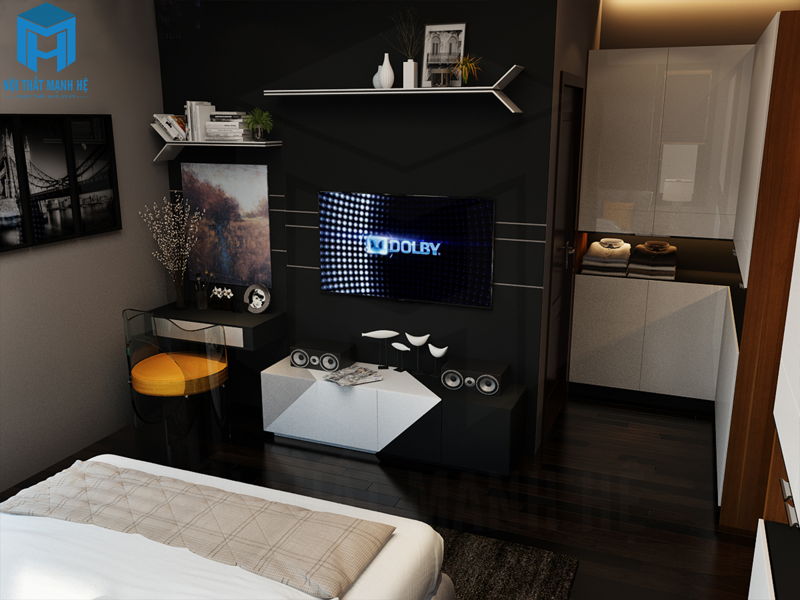 Không gian thư giãn tại phòng ngủ sẽ tuyệt vời hơn nếu được thiết kế thêm kệ tivi sang trọng vừa làm kệ trang trí, vừa làm tủ sách nhỏ nhắn.