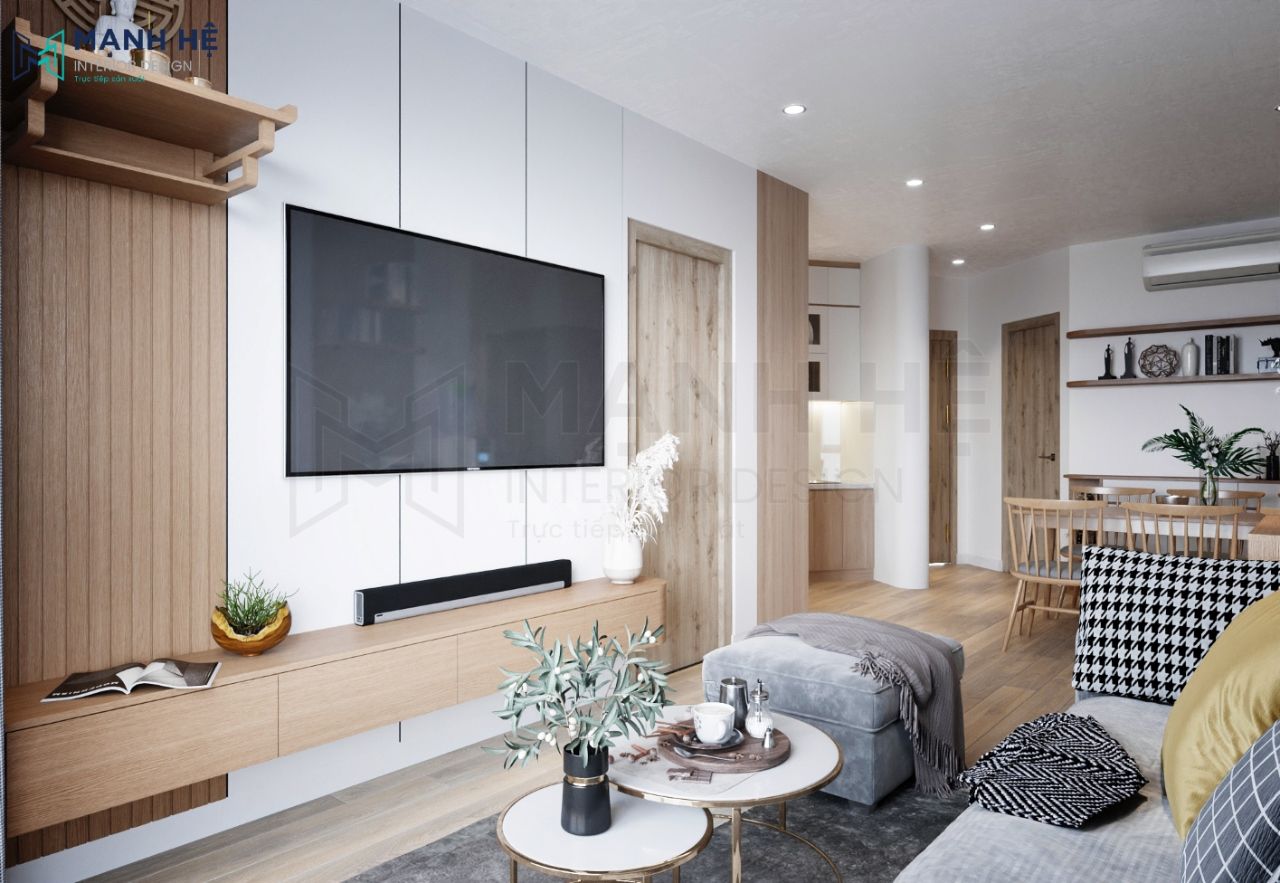 Thiết kế kệ tivi tích hợp thêm bàn trà từ gỗ công nghiệp. Vách ốp tường gỗ vẫn là điểm nhấn cho không gian này. Thêm bộ bàn trà và ghế sofa cho phòng khách thêm tiện nghi.