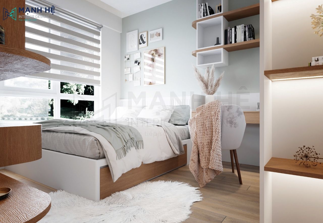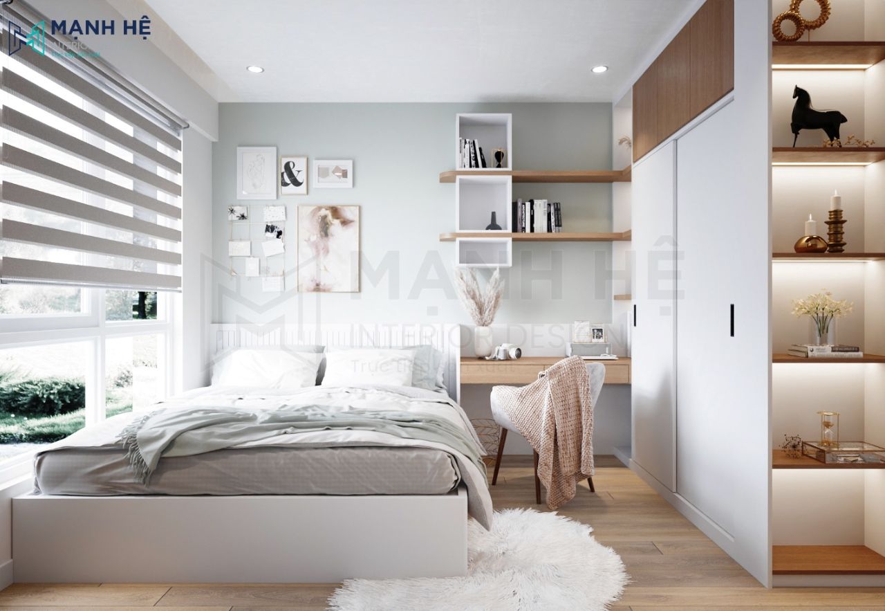 Nội thất cơ bản gồm: tủ quần áo, giường ngủ, kệ trang trí và bàn làm việc từ gỗ công nghiệp phủ melamine. Tối ưu ánh sáng căn phòng nhờ hệ thống đèn led âm trần và thiết kế rèm roman.